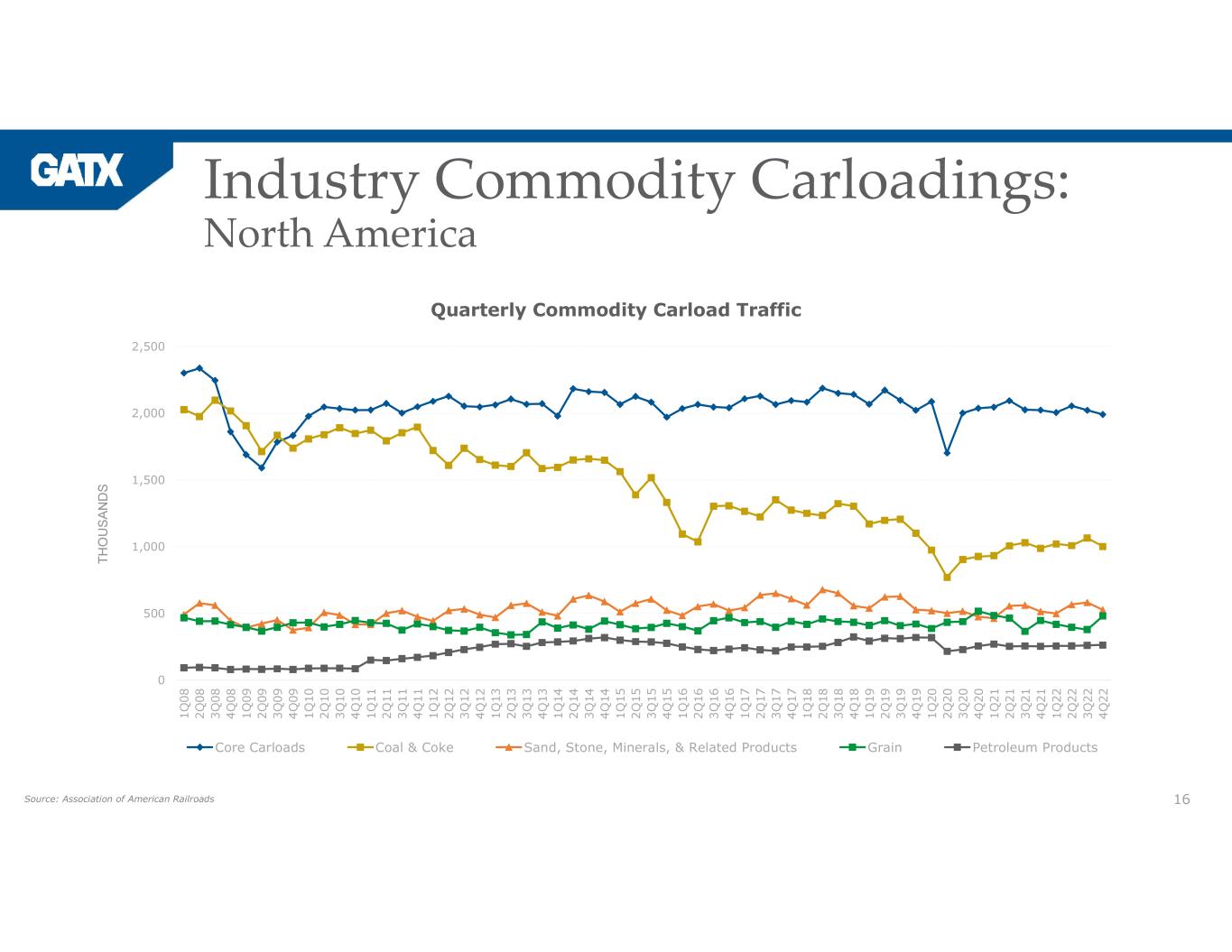 Industry Shipment Composition (Based on 2022 U.S and Canadian carloads of approximately 15.9M) 0 2 4 6 8 10 12 14 2008 2010 2012 2014 2016 2018 2020 2022 Carloads (excl. Coal) Coal-only Carloads 26% 14% 14% 6% 6% 5% 3% 3% 23% Coal & Coke Farm Products Chemicals Petroleum Products Auto Forest & Paper Products Metals Food / Kindred All Other Carloads Originated (United States and Canada) Industry Shipments & Carloadings: North America Source: Association of American Railroads 15