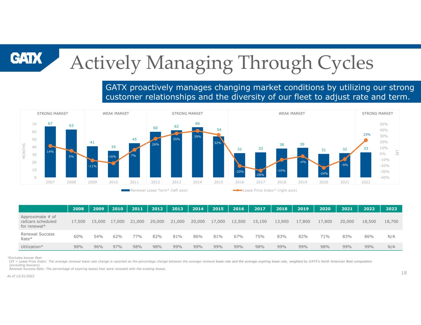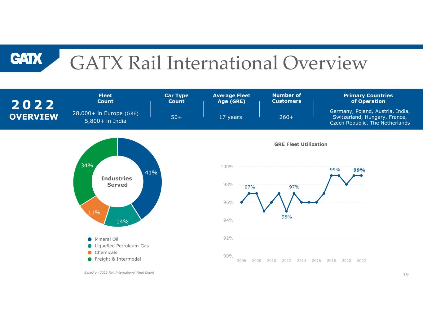 2008 2009 2010 2011 2012 2013 2014 2015 2016 2017 2018 2019 2020 2021 2022 2023 Approximate # of railcars scheduled for renewal* 17,500 15,000 17,000 21,000 20,000 21,000 20,000 17,000 12,500 15,100 13,900 17,800 17,800 20,000 18,500 18,700 Renewal Success Rate* 60% 54% 62% 77% 82% 81% 86% 81% 67% 75% 83% 82% 71% 83% 86% N/A Utilization* 98% 96% 97% 98% 98% 99% 99% 99% 99% 98% 99% 99% 98% 99% 99% N/A Actively Managing Through Cycles 67 63 41 35 45 60 62 66 54 32 33 38 39 31 32 33 14% 5% -11% -16% 7% 26% 35% 39% 32% -20% -28% -10% -4% -24% -9% , 23% -40% -30% -20% -10% 0% 10% 20% 30% 40% 50% 0 10 20 30 40 50 60 70 2007 2008 2009 2010 2011 2012 2013 2014 2015 2016 2017 2018 2019 2020 2021 2022 Renewal Lease Term* (left axis) Lease Price Index* (right axis) STRONG MARKET *Excludes boxcar fleet LPI = Lease Price Index: The average renewal lease rate change is reported as the percentage change between the average renewal (excluding boxcars). Renewal Success Rate: The percentage of expiring leases that were renewed with the existing lessee. As of 12/31/2022 18 GATX proactively manages changing market conditions by utilizing our strong customer relationships and the diversity of our fleet to adjust rate and term. WEAK MARKET STRONG MARKET WEAK MARKET STRONG MARKET