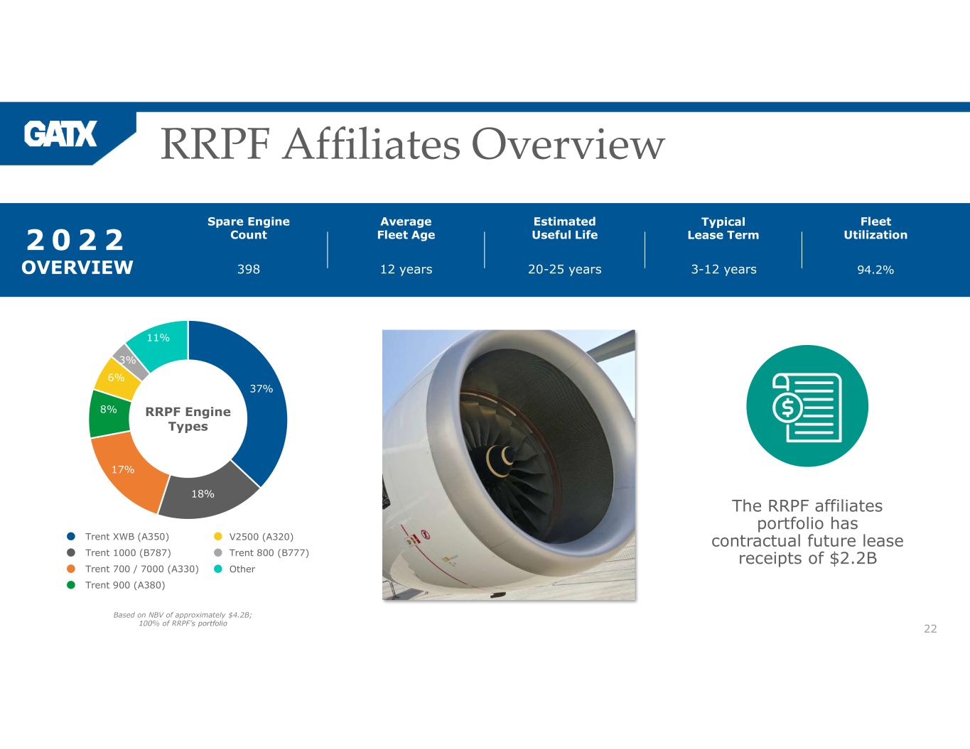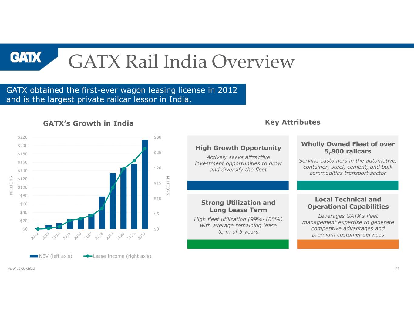 $0 $5 $10 $15 $20 $25 $30 $0 $20 $40 $60 $80 $100 $120 $140 $160 $180 $200 $220 NBV (left axis) Lease Income (right axis) 21As of 12/31/2022 GATX obtained the first-ever wagon leasing license in 2012 and is the largest private railcar lessor in India. GATX Rail India Overview Key Attributes Local Technical and Operational Capabilities management expertise to generate competitive advantages and premium customer services Wholly Owned Fleet of over 5,800 railcars Serving customers in the automotive, container, steel, cement, and bulk commodities transport sector Strong Utilization and Long Lease Term High fleet utilization (99%-100%) with average remaining lease term of 5 years High Growth Opportunity Actively seeks attractive investment opportunities to grow and diversify the fleet
