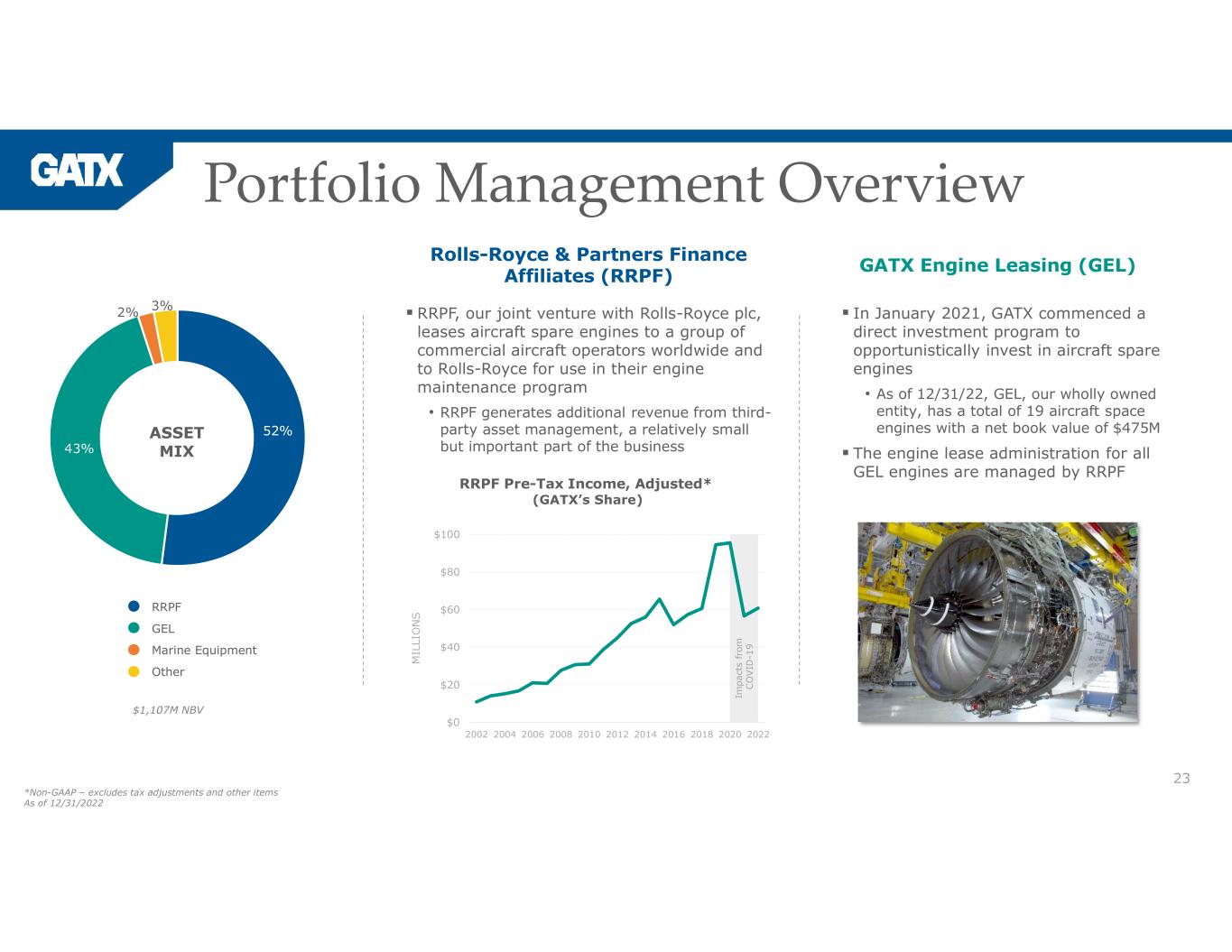 52% 43% 2% 3% $1,107M NBV Rolls-Royce & Partners Finance Affiliates (RRPF) RRPF GEL Marine Equipment Other $0 $20 $40 $60 $80 $100 2002 2004 2006 2008 2010 2012 2014 2016 2018 2020 2022 RRPF Pre-Tax Income, Adjusted* ASSET MIX 23 Portfolio Management Overview GATX Engine Leasing (GEL) In January 2021, GATX commenced a direct investment program to opportunistically invest in aircraft spare engines As of 12/31/22, GEL, our wholly owned entity, has a total of 19 aircraft space engines with a net book value of $475M The engine lease administration for all GEL engines are managed by RRPF RRPF, our joint venture with Rolls-Royce plc, leases aircraft spare engines to a group of commercial aircraft operators worldwide and to Rolls-Royce for use in their engine maintenance program RRPF generates additional revenue from third- party asset management, a relatively small but important part of the business *Non-GAAP excludes tax adjustments and other items As of 12/31/2022