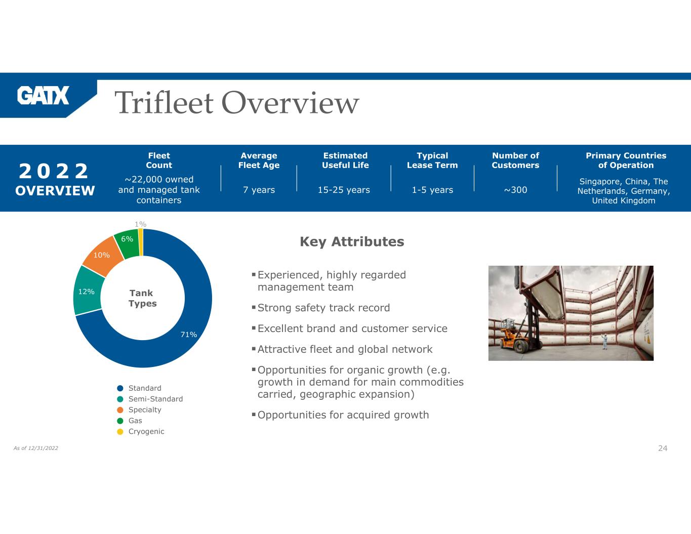 71% 12% 10% 6% Trifleet Overview 2 0 2 2 OVERVIEW Fleet Count Average Fleet Age Estimated Useful Life Typical Lease Term Primary Countries of Operation ~22,000 owned and managed tank containers 7 years 15-25 years 1-5 years Singapore, China, The Netherlands, Germany, United Kingdom Tank Types 24 Number of Customers ~300 Standard Semi-Standard Specialty Gas Cryogenic 1% Experienced, highly regarded management team Strong safety track record Excellent brand and customer service Attractive fleet and global network Opportunities for organic growth (e.g. growth in demand for main commodities carried, geographic expansion) Opportunities for acquired growth As of 12/31/2022 Key Attributes