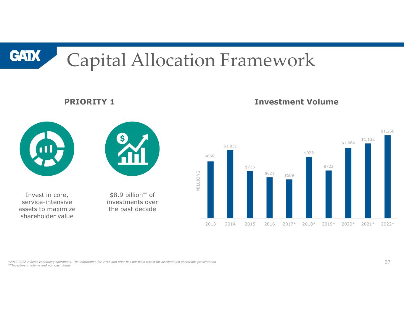 Operating Cash Flow Portfolio Proceeds $1,011 $766 $530 $359 $221 $573 2023 2024 2025 2026 2027 Thereafter GATX Contractual Future Lease Receipts** Operating Cash Flow & Portfolio Proceeds 26 Financial Highlights: High-Quality and Consistent Cash Flows *2017-2022 reflects continuing operations. Information for 2016 and prior has not been recast for discontinued operations presentation. As of 12/31/2022 Our strong operating cash flow provides tremendous capital allocation flexibility. GATX has over $3.4 billion in contractual future lease receipts.