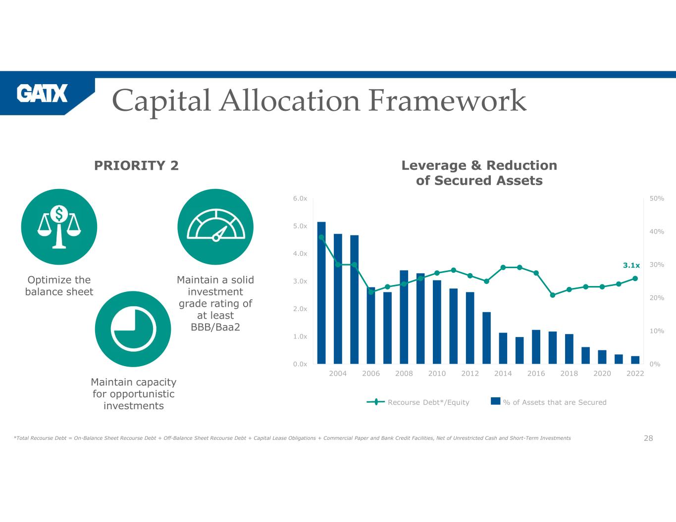 Capital Allocation Framework 27 PRIORITY 1 Invest in core, service-intensive assets to maximize shareholder value $8.9 billion** of investments over the past decade *2017-2022 reflects continuing operations. The information for 2016 and prior has not been recast for discontinued operations presentation **Investment volume and non-cash items Investment Volume $860 $1,031 $715 $621 $589 $928 $723 $1,064 $1,132 $1,256 2013 2014 2015 2016 2017* 2018* 2019* 2020* 2021* 2022*