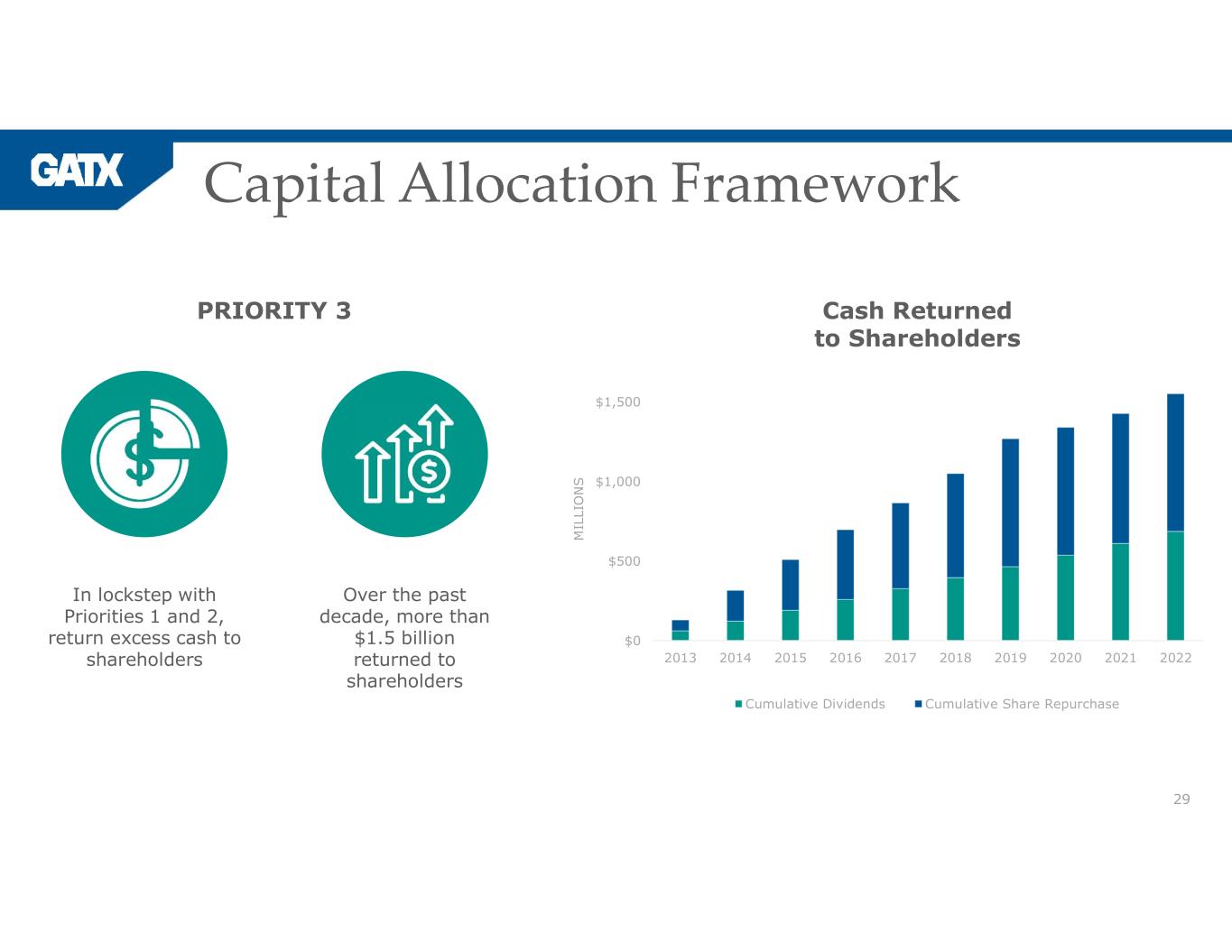 Capital Allocation Framework 28 PRIORITY 2 Optimize the balance sheet Maintain a solid investment grade rating of at least BBB/Baa2 Maintain capacity for opportunistic investments *Total Recourse Debt = On-Balance Sheet Recourse Debt + Off-Balance Sheet Recourse Debt + Capital Lease Obligations + Commercial Paper and Bank Credit Facilities, Net of Unrestricted Cash and Short-Term Investments Leverage & Reduction of Secured Assets 0% 10% 20% 30% 40% 50% 0.0x 1.0x 2.0x 3.0x 4.0x 5.0x 6.0x 2004 2006 2008 2010 2012 2014 2016 2018 2020 2022 Recourse Debt*/Equity % of Assets that are Secured 3.1x