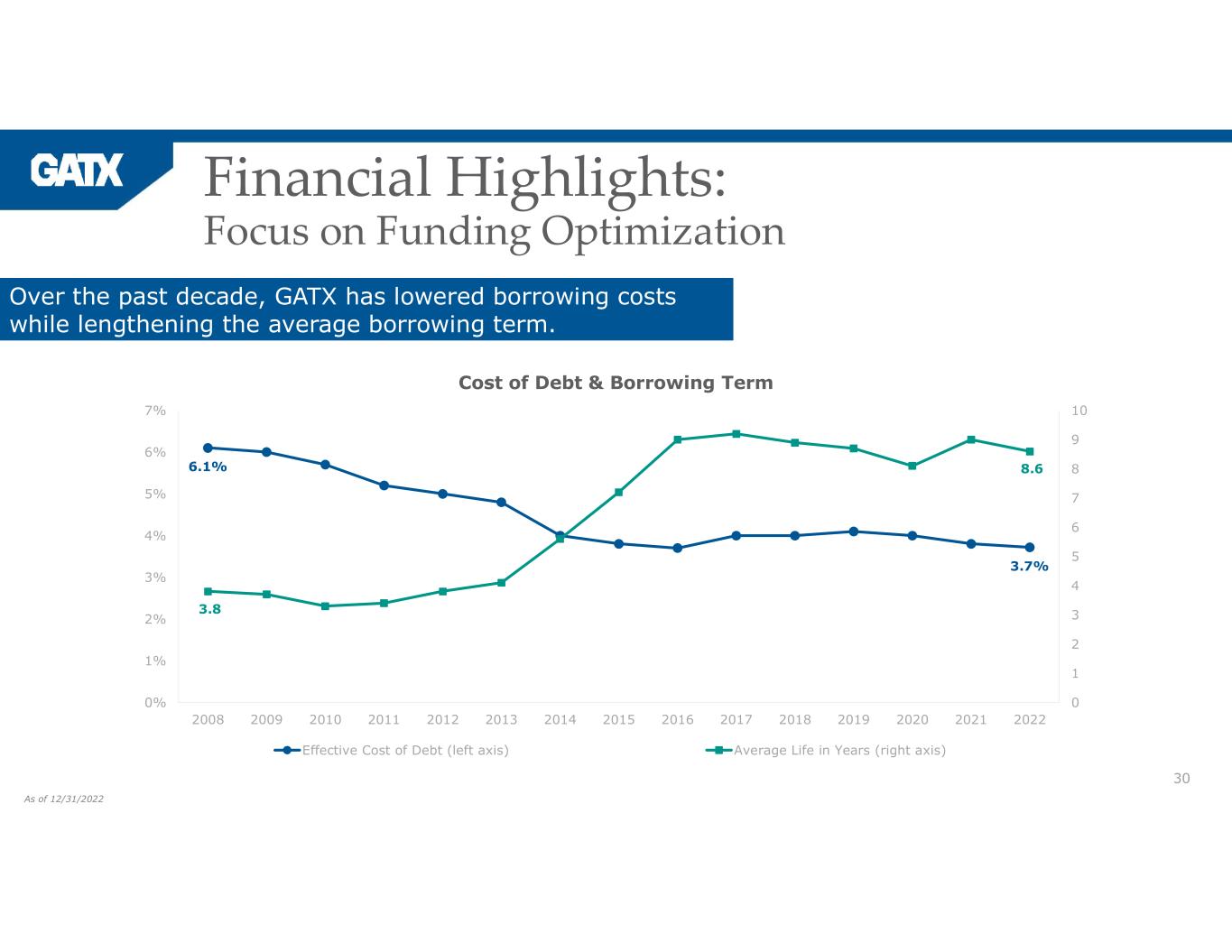 6.1% 3.7% 3.8 8.6 0 1 2 3 4 5 6 7 8 9 10 0% 1% 2% 3% 4% 5% 6% 7% 2008 2009 2010 2011 2012 2013 2014 2015 2016 2017 2018 2019 2020 2021 2022 Effective Cost of Debt (left axis) Average Life in Years (right axis) Cost of Debt & Borrowing Term 30 Financial Highlights: Focus on Funding Optimization As of 12/31/2022 Over the past decade, GATX has lowered borrowing costs while lengthening the average borrowing term.