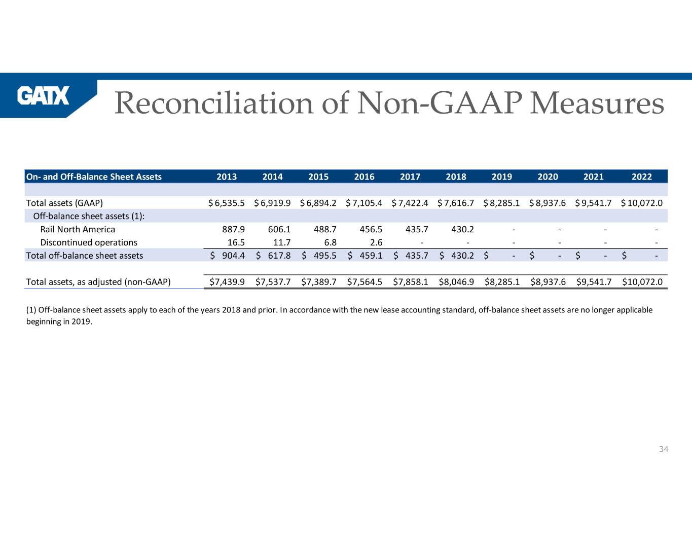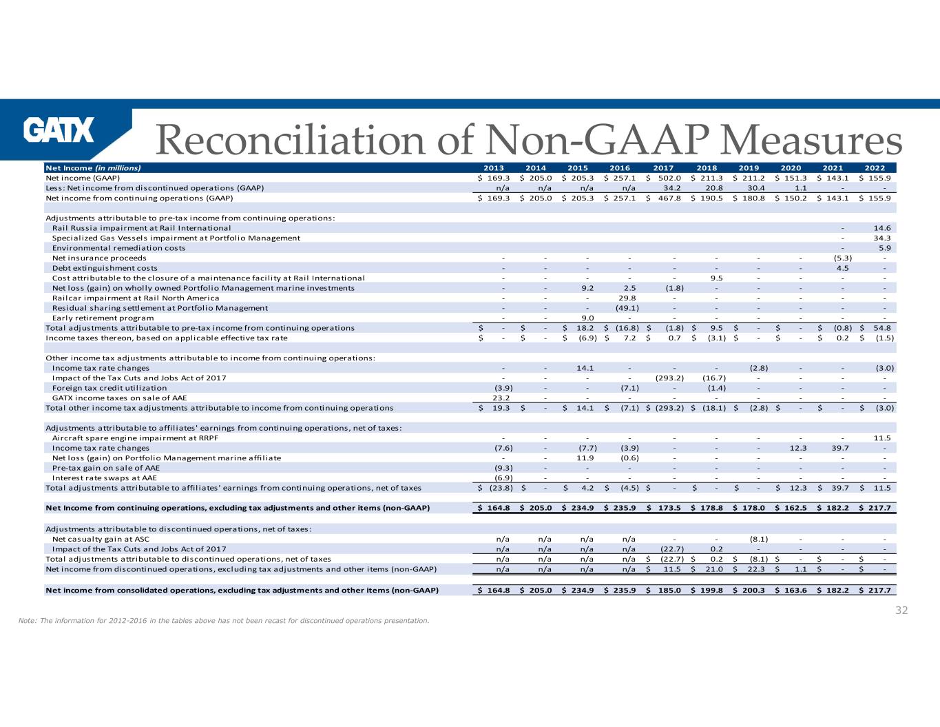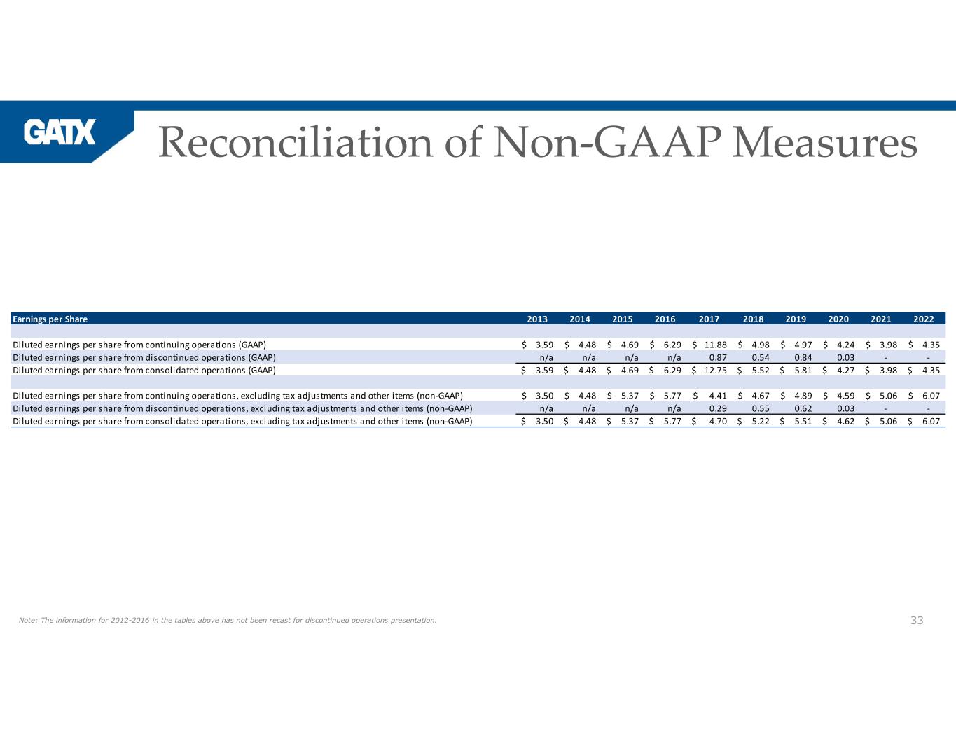 32 Reconciliation of Non-GAAP Measures Note: The information for 2012-2016 in the tables above has not been recast for discontinued operations presentation. Net Income (in millions) 2013 2014 2015 2016 2017 2018 2019 2020 2021 2022 Net income (GAAP) 169.3$ 205.0$ 205.3$ 257.1$ 502.0$ 211.3$ 211.2$ 151.3$ 143.1$ 155.9$ Less: Net income from discontinued operations (GAAP) n/a n/a n/a n/a 34.2 20.8 30.4 1.1 - - Net income from continuing operations (GAAP) 169.3$ 205.0$ 205.3$ 257.1$ 467.8$ 190.5$ 180.8$ 150.2$ 143.1$ 155.9$ Adjustments attributable to pre-tax income from continuing operations: Rail Russia impairment at Rail International - 14.6 Special ized Gas Vessels impairment at Portfolio Management - 34.3 Environmental remediation costs - 5.9 Net insurance proceeds - - - - - - - - (5.3) - Debt extinguishment costs - - - - - - - - 4.5 - Cost attributable to the closure of a maintenance faci li ty at Rail International - - - - - 9.5 - - - - Net loss (gain) on wholly owned Portfolio Management marine investments - - 9.2 2.5 (1.8) - - - - - Railcar impairment at Rail North America - - - 29.8 - - - - - - Residual sharing settlement at Portfolio Management - - - (49.1) - - - - - - Early retirement program - - 9.0 - - - - - - - Total adjustments attributable to pre-tax income from continuing operations -$ -$ 18.2$ (16.8)$ (1.8)$ 9.5$ -$ -$ (0.8)$ 54.8$ Income taxes thereon, based on applicable effective tax rate -$ -$ (6.9)$ 7.2$ 0.7$ (3.1)$ -$ -$ 0.2$ (1.5)$ Other income tax adjustments attributable to income from continuing operations: Income tax rate changes - - 14.1 - - - (2.8) - - (3.0) Impact of the Tax Cuts and Jobs Act of 2017 - - - - (293.2) (16.7) - - - - Foreign tax credit uti lization (3.9) - - (7.1) - (1.4) - - - - GATX income taxes on sale of AAE 23.2 - - - - - - - - - Total other income tax adjustments attributable to income from continuing operations 19.3$ -$ 14.1$ (7.1)$ (293.2)$ (18.1)$ (2.8)$ -$ -$ (3.0)$ Adjustments attributable to affil iates' earnings from continuing operations, net of taxes: Aircraft spare engine impairment at RRPF - - - - - - - - - 11.5 Income tax rate changes (7.6) - (7.7) (3.9) - - - 12.3 39.7 - Net loss (gain) on Portfolio Management marine affi l iate - - 11.9 (0.6) - - - - - - Pre-tax gain on sale of AAE (9.3) - - - - - - - - - Interest rate swaps at AAE (6.9) - - - - - - - - - Total adjustments attributable to affil iates' earnings from continuing operations, net of taxes (23.8)$ -$ 4.2$ (4.5)$ -$ -$ -$ 12.3$ 39.7$ 11.5$ Net Income from continuing operations, excluding tax adjustments and other items (non-GAAP) 164.8$ 205.0$ 234.9$ 235.9$ 173.5$ 178.8$ 178.0$ 162.5$ 182.2$ 217.7$ Adjustments attributable to discontinued operations, net of taxes: Net casualty gain at ASC n/a n/a n/a n/a - - (8.1) - - - Impact of the Tax Cuts and Jobs Act of 2017 n/a n/a n/a n/a (22.7) 0.2 - - - - Total adjustments attributable to discontinued operations, net of taxes n/a n/a n/a n/a (22.7)$ 0.2$ (8.1)$ -$ -$ -$ Net income from discontinued operations, excluding tax adjustments and other items (non-GAAP) n/a n/a n/a n/a 11.5$ 21.0$ 22.3$ 1.1$ -$ -$ Net income from consolidated operations, excluding tax adjustments and other items (non-GAAP) 164.8$ 205.0$ 234.9$ 235.9$ 185.0$ 199.8$ 200.3$ 163.6$ 182.2$ 217.7$