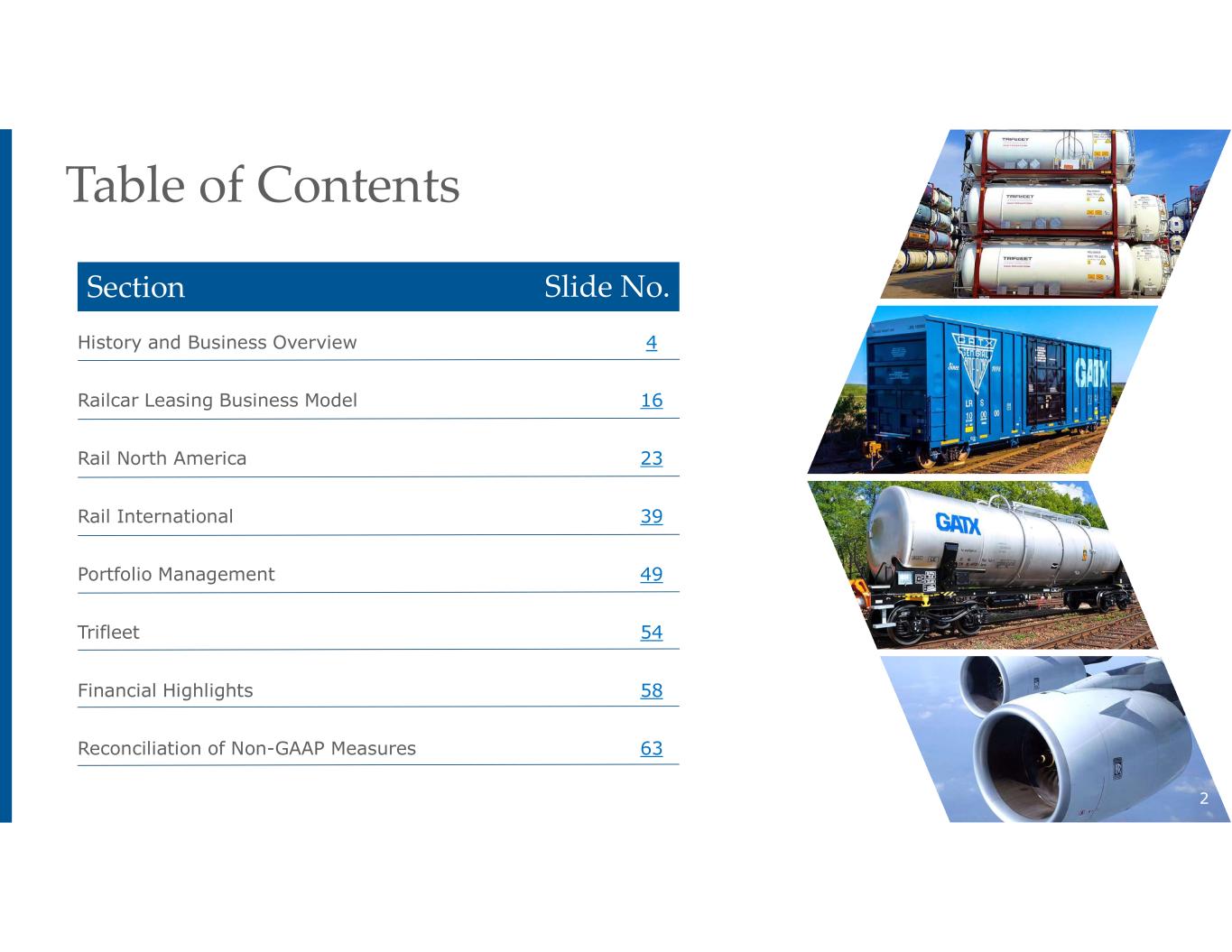 2 History and Business Overview Railcar Leasing Business Model Rail North America Rail International Portfolio Management Trifleet Financial Highlights Reconciliation of Non-GAAP Measures 4 16 23 39 49 54 58 63 Section Slide No. Table of Contents