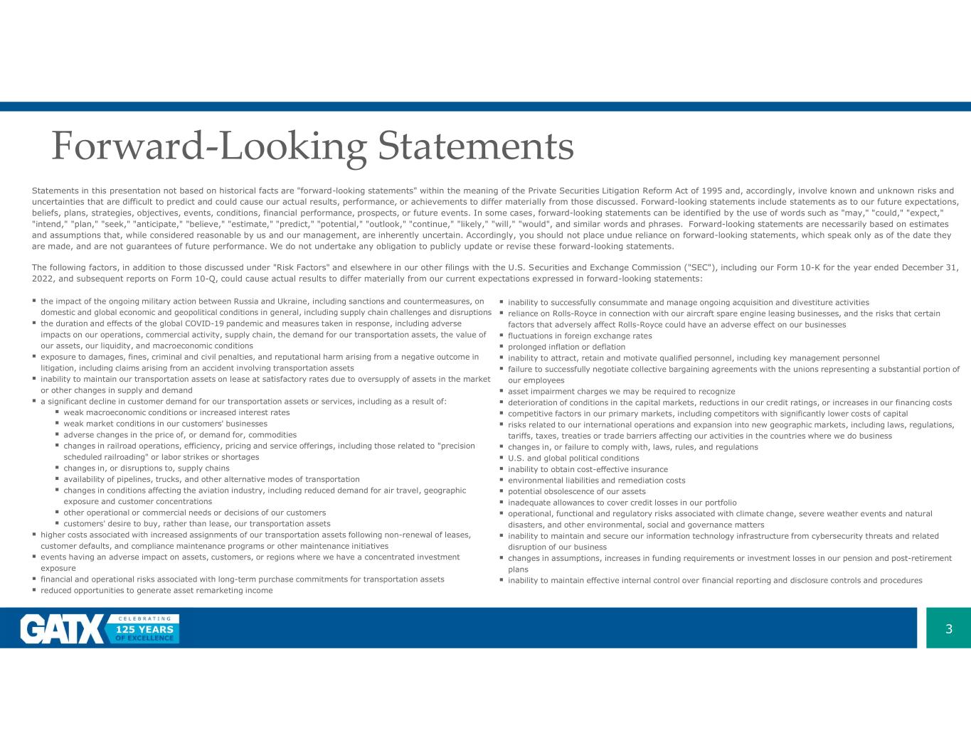 3 Forward-Looking Statements Statements in this presentation not based on historical facts are "forward-looking statements" within the meaning of the Private Securities Litigation Reform Act of 1995 and, accordingly, involve known and unknown risks and uncertainties that are difficult to predict and could cause our actual results, performance, or achievements to differ materially from those discussed. Forward-looking statements include statements as to our future expectations, beliefs, plans, strategies, objectives, events, conditions, financial performance, prospects, or future events. In some cases, forward-looking statements can be identified by the use of words such as "may," "could," "expect," "intend," "plan," "seek," "anticipate," "believe," "estimate," "predict," "potential," "outlook," "continue," "likely," "will," "would", and similar words and phrases. Forward-looking statements are necessarily based on estimates and assumptions that, while considered reasonable by us and our management, are inherently uncertain. Accordingly, you should not place undue reliance on forward-looking statements, which speak only as of the date they are made, and are not guarantees of future performance. We do not undertake any obligation to publicly update or revise these forward-looking statements. The following factors, in addition to those discussed under "Risk Factors" and elsewhere in our other filings with the U.S. Securities and Exchange Commission ("SEC"), including our Form 10-K for the year ended December 31, 2022, and subsequent reports on Form 10-Q, could cause actual results to differ materially from our current expectations expressed in forward-looking statements: the impact of the ongoing military action between Russia and Ukraine, including sanctions and countermeasures, on domestic and global economic and geopolitical conditions in general, including supply chain challenges and disruptions the duration and effects of the global COVID-19 pandemic and measures taken in response, including adverse impacts on our operations, commercial activity, supply chain, the demand for our transportation assets, the value of our assets, our liquidity, and macroeconomic conditions exposure to damages, fines, criminal and civil penalties, and reputational harm arising from a negative outcome in litigation, including claims arising from an accident involving transportation assets inability to maintain our transportation assets on lease at satisfactory rates due to oversupply of assets in the market or other changes in supply and demand a significant decline in customer demand for our transportation assets or services, including as a result of: weak macroeconomic conditions or increased interest rates weak market conditions in our customers' businesses adverse changes in the price of, or demand for, commodities changes in railroad operations, efficiency, pricing and service offerings, including those related to "precision scheduled railroading" or labor strikes or shortages changes in, or disruptions to, supply chains availability of pipelines, trucks, and other alternative modes of transportation changes in conditions affecting the aviation industry, including reduced demand for air travel, geographic exposure and customer concentrations other operational or commercial needs or decisions of our customers customers' desire to buy, rather than lease, our transportation assets higher costs associated with increased assignments of our transportation assets following non-renewal of leases, customer defaults, and compliance maintenance programs or other maintenance initiatives events having an adverse impact on assets, customers, or regions where we have a concentrated investment exposure financial and operational risks associated with long-term purchase commitments for transportation assets reduced opportunities to generate asset remarketing income inability to successfully consummate and manage ongoing acquisition and divestiture activities reliance on Rolls-Royce in connection with our aircraft spare engine leasing businesses, and the risks that certain factors that adversely affect Rolls-Royce could have an adverse effect on our businesses fluctuations in foreign exchange rates prolonged inflation or deflation inability to attract, retain and motivate qualified personnel, including key management personnel failure to successfully negotiate collective bargaining agreements with the unions representing a substantial portion of our employees asset impairment charges we may be required to recognize deterioration of conditions in the capital markets, reductions in our credit ratings, or increases in our financing costs competitive factors in our primary markets, including competitors with significantly lower costs of capital risks related to our international operations and expansion into new geographic markets, including laws, regulations, tariffs, taxes, treaties or trade barriers affecting our activities in the countries where we do business changes in, or failure to comply with, laws, rules, and regulations U.S. and global political conditions inability to obtain cost-effective insurance environmental liabilities and remediation costs potential obsolescence of our assets inadequate allowances to cover credit losses in our portfolio operational, functional and regulatory risks associated with climate change, severe weather events and natural disasters, and other environmental, social and governance matters inability to maintain and secure our information technology infrastructure from cybersecurity threats and related disruption of our business changes in assumptions, increases in funding requirements or investment losses in our pension and post-retirement plans inability to maintain effective internal control over financial reporting and disclosure controls and procedures