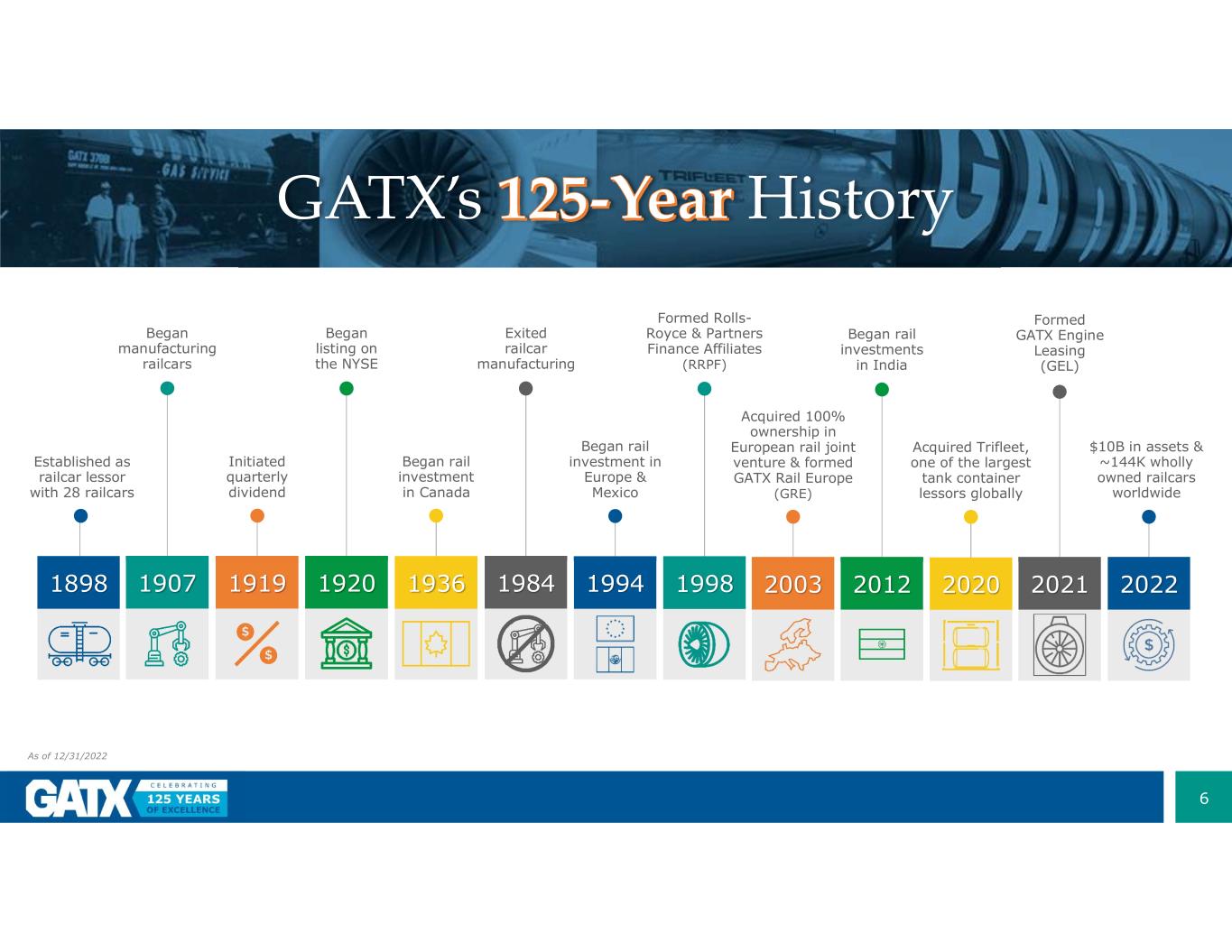 6 As of 12/31/2022 History Established as railcar lessor with 28 railcars 1898 Exited railcar manufacturing 1984 Began rail investment in Europe & Mexico 1994 Formed Rolls- Royce & Partners Finance Affiliates (RRPF) 1998 Acquired 100% ownership in European rail joint venture & formed GATX Rail Europe (GRE) 2003 Began rail investments in India 2012 Acquired Trifleet, one of the largest tank container lessors globally 2020 Began manufacturing railcars 1907 Initiated quarterly dividend 1919 Formed GATX Engine Leasing (GEL) 2021 Began listing on the NYSE 1920 $10B in assets & ~144K wholly owned railcars worldwide 2022 Began rail investment in Canada 1936