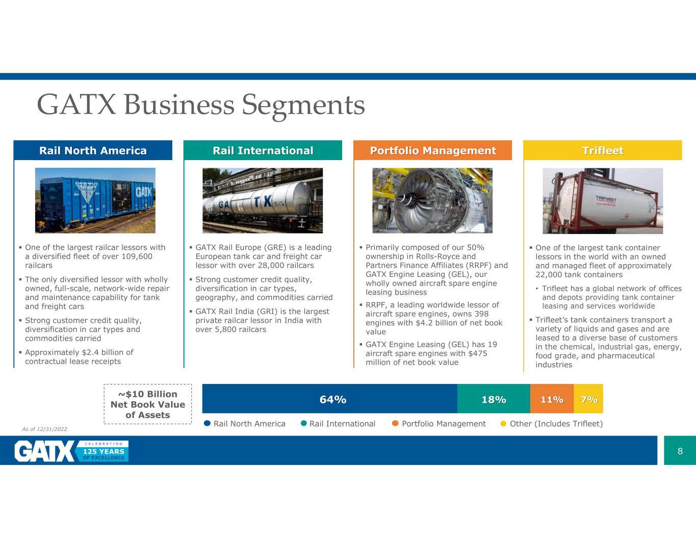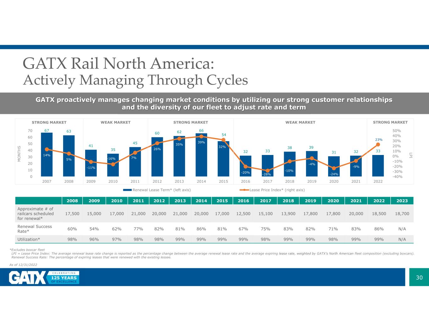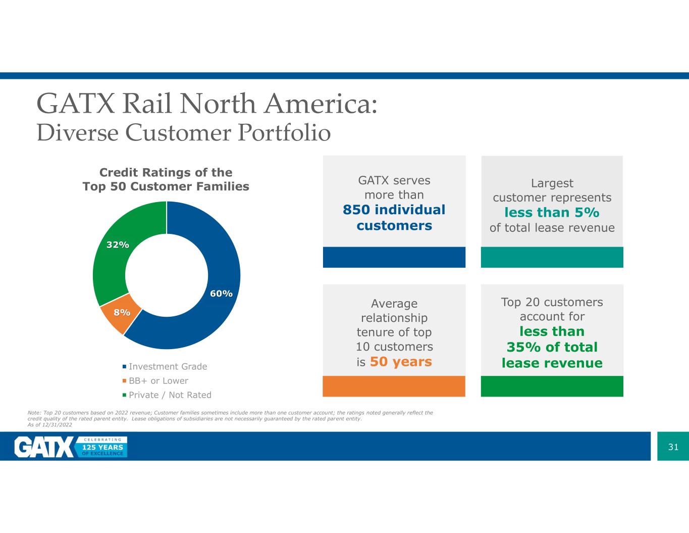 30 2008 2009 2010 2011 2012 2013 2014 2015 2016 2017 2018 2019 2020 2021 2022 2023 Approximate # of railcars scheduled for renewal* 17,500 15,000 17,000 21,000 20,000 21,000 20,000 17,000 12,500 15,100 13,900 17,800 17,800 20,000 18,500 18,700 Renewal Success Rate* 60% 54% 62% 77% 82% 81% 86% 81% 67% 75% 83% 82% 71% 83% 86% N/A Utilization* 98% 96% 97% 98% 98% 99% 99% 99% 99% 98% 99% 99% 98% 99% 99% N/A *Excludes boxcar fleet LPI = Lease Price Index: The average renewal lease rate change is reported as the percentage change between the average renewal lease rate and the average expiring fleet composition (excluding boxcars). Renewal Success Rate: The percentage of expiring leases that were renewed with the existing lessee. As of 12/31/2022 67 63 41 35 45 60 62 66 54 32 33 38 39 31 32 33 14% 5% -11% -16% 7% 26% 35% 39% 32% -20% -28% -10% -4% -24% -9% , 23% -40% -30% -20% -10% 0% 10% 20% 30% 40% 50% 0 10 20 30 40 50 60 70 2007 2008 2009 2010 2011 2012 2013 2014 2015 2016 2017 2018 2019 2020 2021 2022 Renewal Lease Term* (left axis) Lease Price Index* (right axis) STRONG MARKET WEAK MARKET STRONG MARKET WEAK MARKET STRONG MARKET GATX proactively manages changing market conditions by utilizing our strong customer relationships and the diversity of our fleet to adjust rate and term GATX Rail North America: Actively Managing Through Cycles