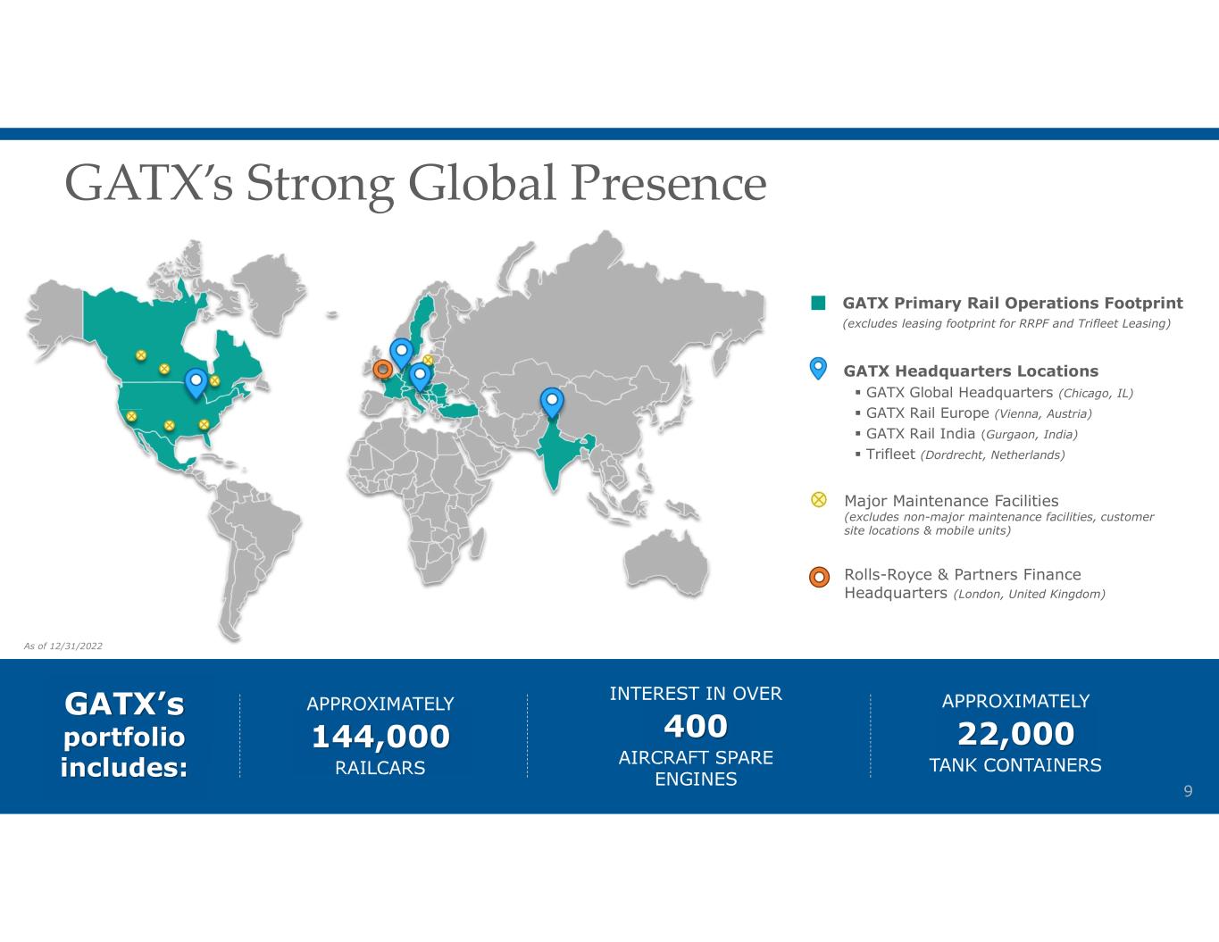 8 As of 12/31/2022 ~$10 Billion Net Book Value of Assets 64% 18% 11% 7% Rail North America Rail International Portfolio Management Other (Includes Trifleet) One of the largest railcar lessors with a diversified fleet of over 109,600 railcars The only diversified lessor with wholly owned, full-scale, network-wide repair and maintenance capability for tank and freight cars Strong customer credit quality, diversification in car types and commodities carried Approximately $2.4 billion of contractual lease receipts Rail North America Rail International GATX Rail Europe (GRE) is a leading European tank car and freight car lessor with over 28,000 railcars Strong customer credit quality, diversification in car types, geography, and commodities carried GATX Rail India (GRI) is the largest private railcar lessor in India with over 5,800 railcars Portfolio Management Primarily composed of our 50% ownership in Rolls-Royce and Partners Finance Affiliates (RRPF) and GATX Engine Leasing (GEL), our wholly owned aircraft spare engine leasing business RRPF, a leading worldwide lessor of aircraft spare engines, owns 398 engines with $4.2 billion of net book value GATX Engine Leasing (GEL) has 19 aircraft spare engines with $475 million of net book value Trifleet One of the largest tank container lessors in the world with an owned and managed fleet of approximately 22,000 tank containers Trifleet has a global network of offices and depots providing tank container leasing and services worldwide containers transport a variety of liquids and gases and are leased to a diverse base of customers in the chemical, industrial gas, energy, food grade, and pharmaceutical industries GATX Business Segments