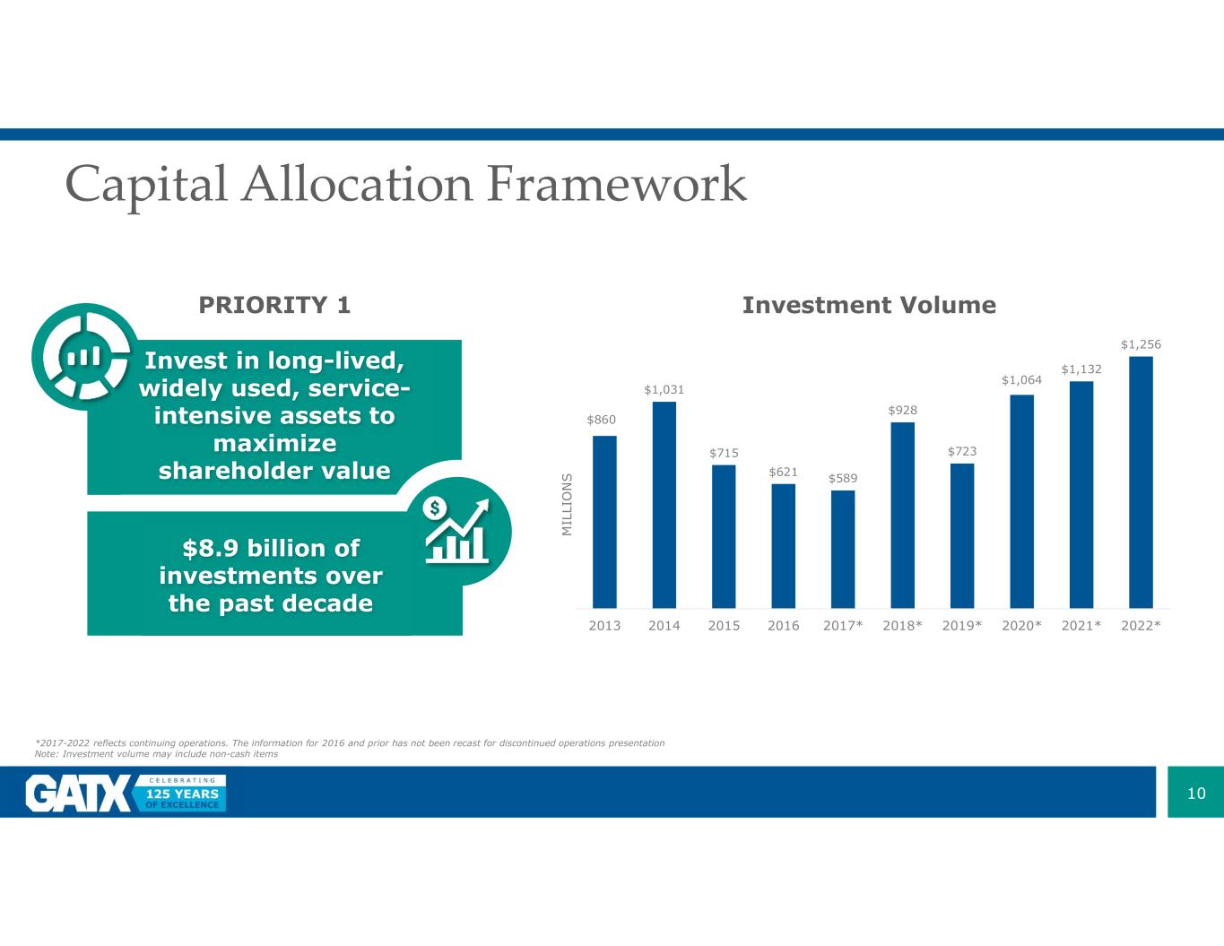 9 (excludes leasing footprint for RRPF and Trifleet Leasing) GATX Primary Rail Operations Footprint Major Maintenance Facilities (excludes non-major maintenance facilities, customer site locations & mobile units) Rolls-Royce & Partners Finance Headquarters (London, United Kingdom) AIRCRAFT SPARE ENGINES 400 INTEREST IN OVER TANK CONTAINERS 22,000 APPROXIMATELY RAILCARS 144,000 APPROXIMATELY portfolio includes: GATX Headquarters Locations GATX Global Headquarters (Chicago, IL) GATX Rail Europe (Vienna, Austria) GATX Rail India (Gurgaon, India) Trifleet (Dordrecht, Netherlands) As of 12/31/2022 Global Presence