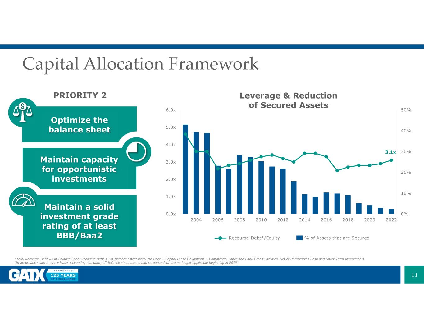 10 *2017-2022 reflects continuing operations. The information for 2016 and prior has not been recast for discontinued operations presentation Note: Investment volume may include non-cash items $860 $1,031 $715 $621 $589 $928 $723 $1,064 $1,132 $1,256 2013 2014 2015 2016 2017* 2018* 2019* 2020* 2021* 2022* Investment VolumePRIORITY 1 Invest in long-lived, widely used, service- intensive assets to maximize shareholder value $8.9 billion of investments over the past decade Capital Allocation Framework