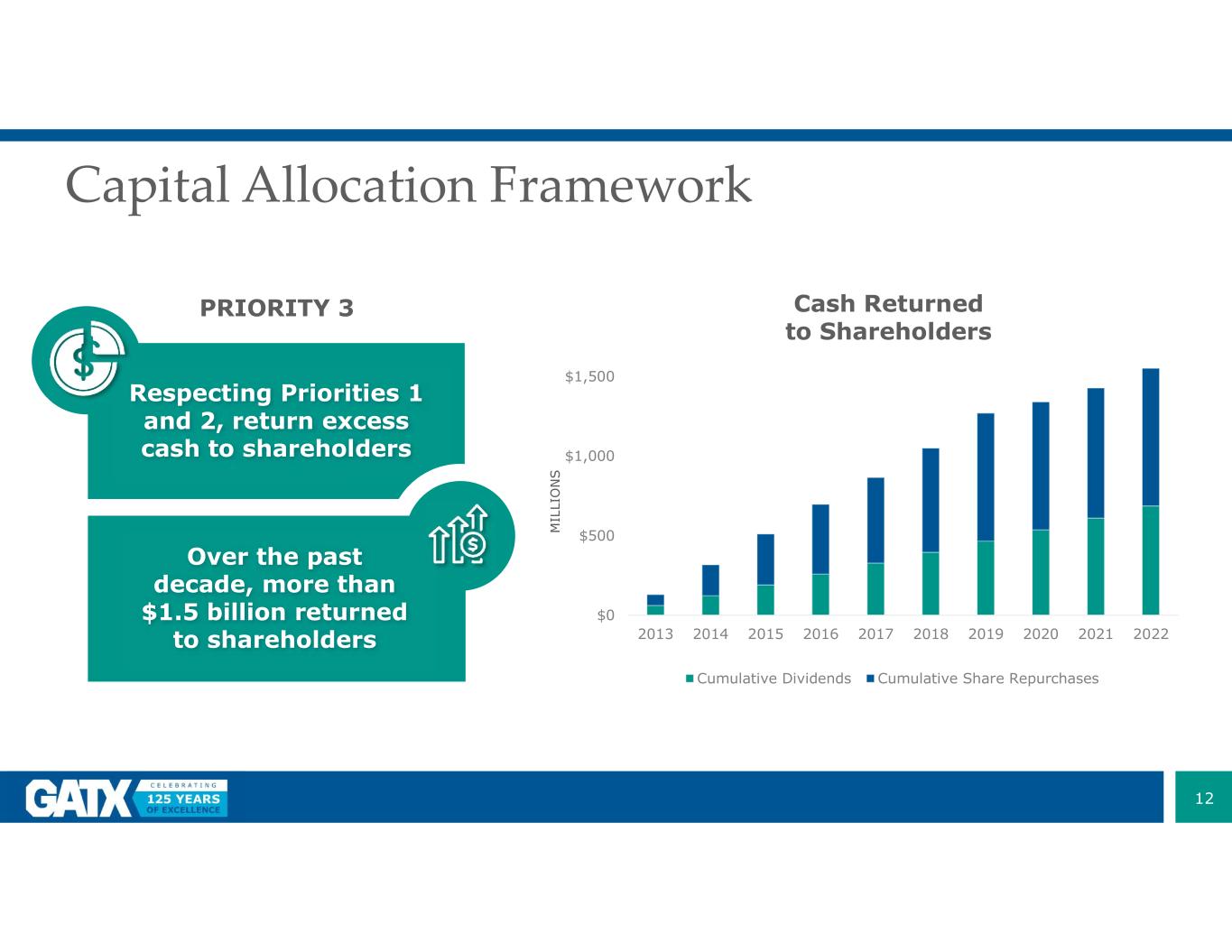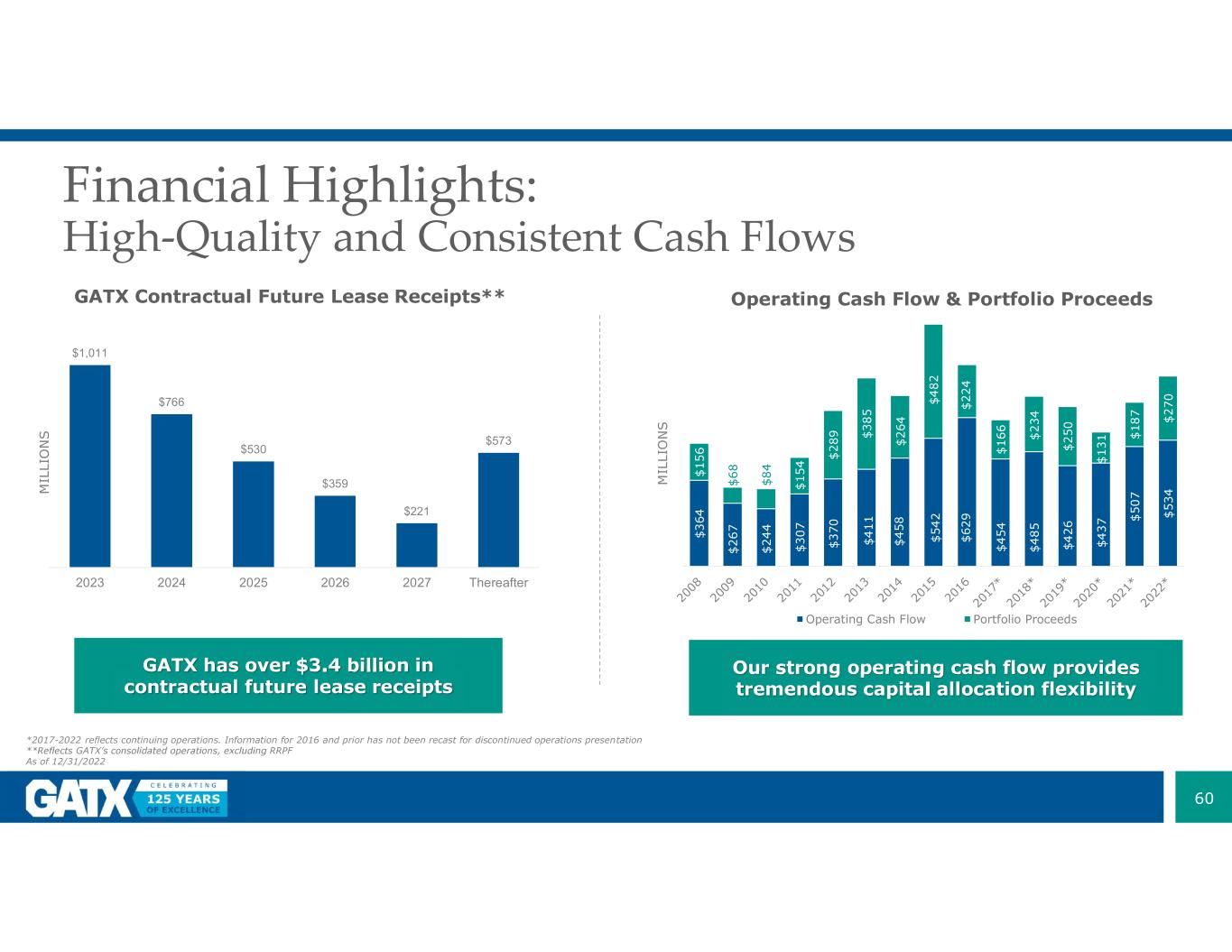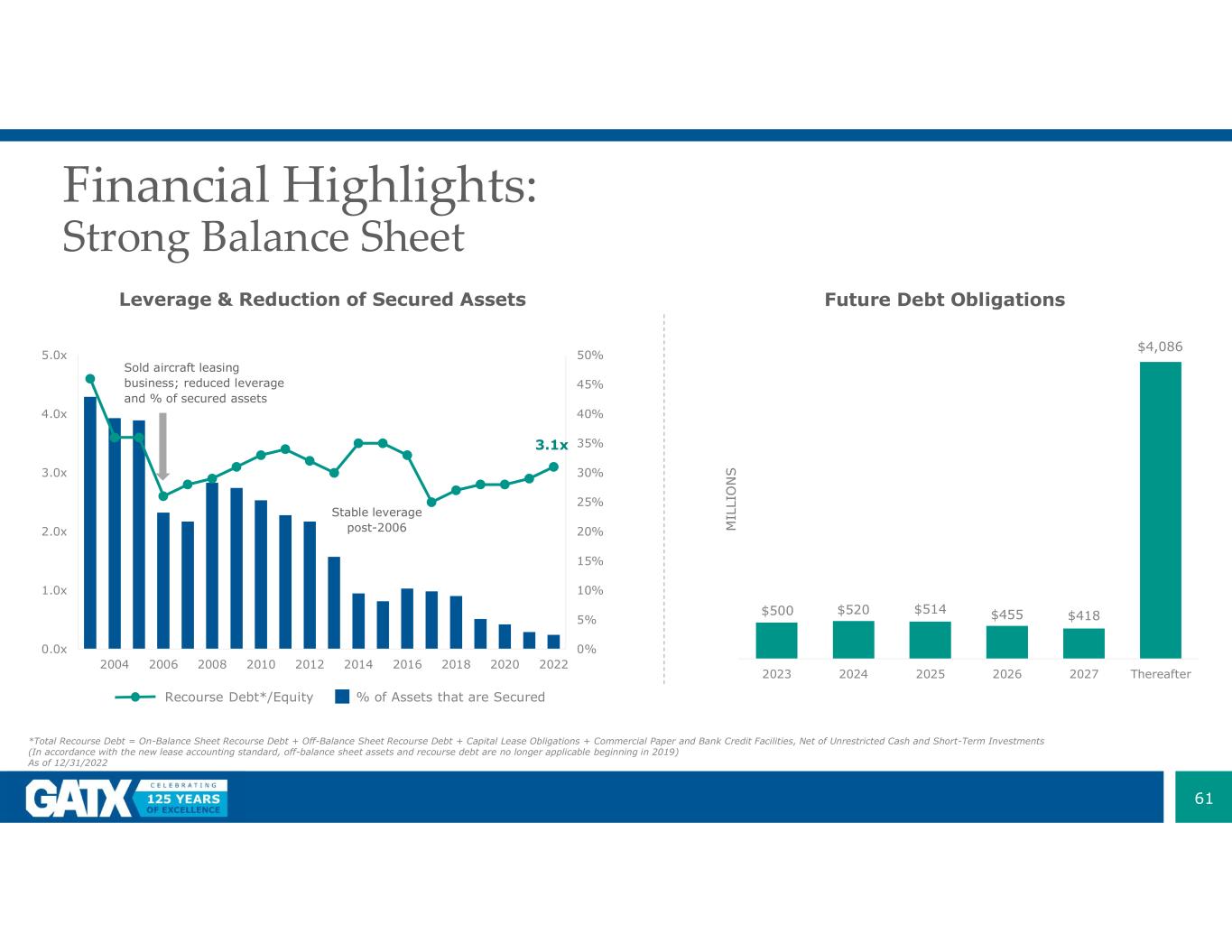 60 $1,011 $766 $530 $359 $221 $573 2023 2024 2025 2026 2027 Thereafter GATX Contractual Future Lease Receipts** *2017-2022 reflects continuing operations. Information for 2016 and prior has not been recast for discontinued operations presentation As of 12/31/2022 Operating Cash Flow Portfolio Proceeds Operating Cash Flow & Portfolio Proceeds GATX has over $3.4 billion in contractual future lease receipts Our strong operating cash flow provides tremendous capital allocation flexibility Financial Highlights: High-Quality and Consistent Cash Flows