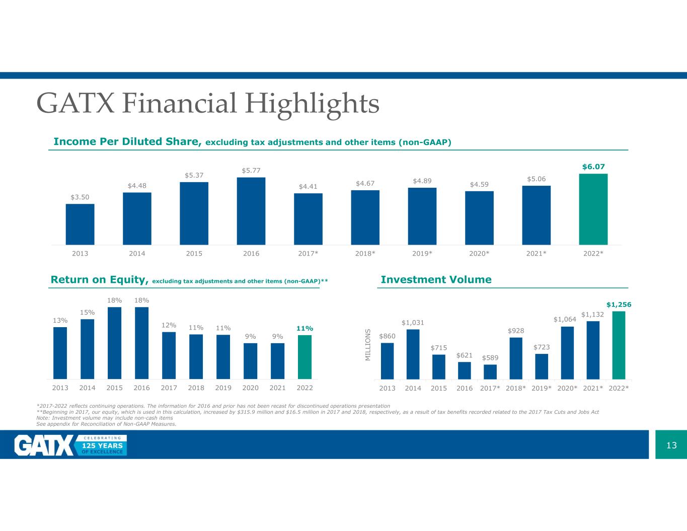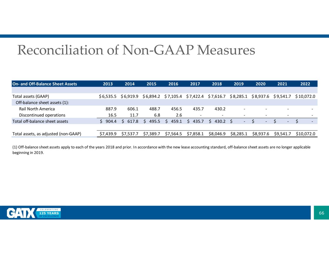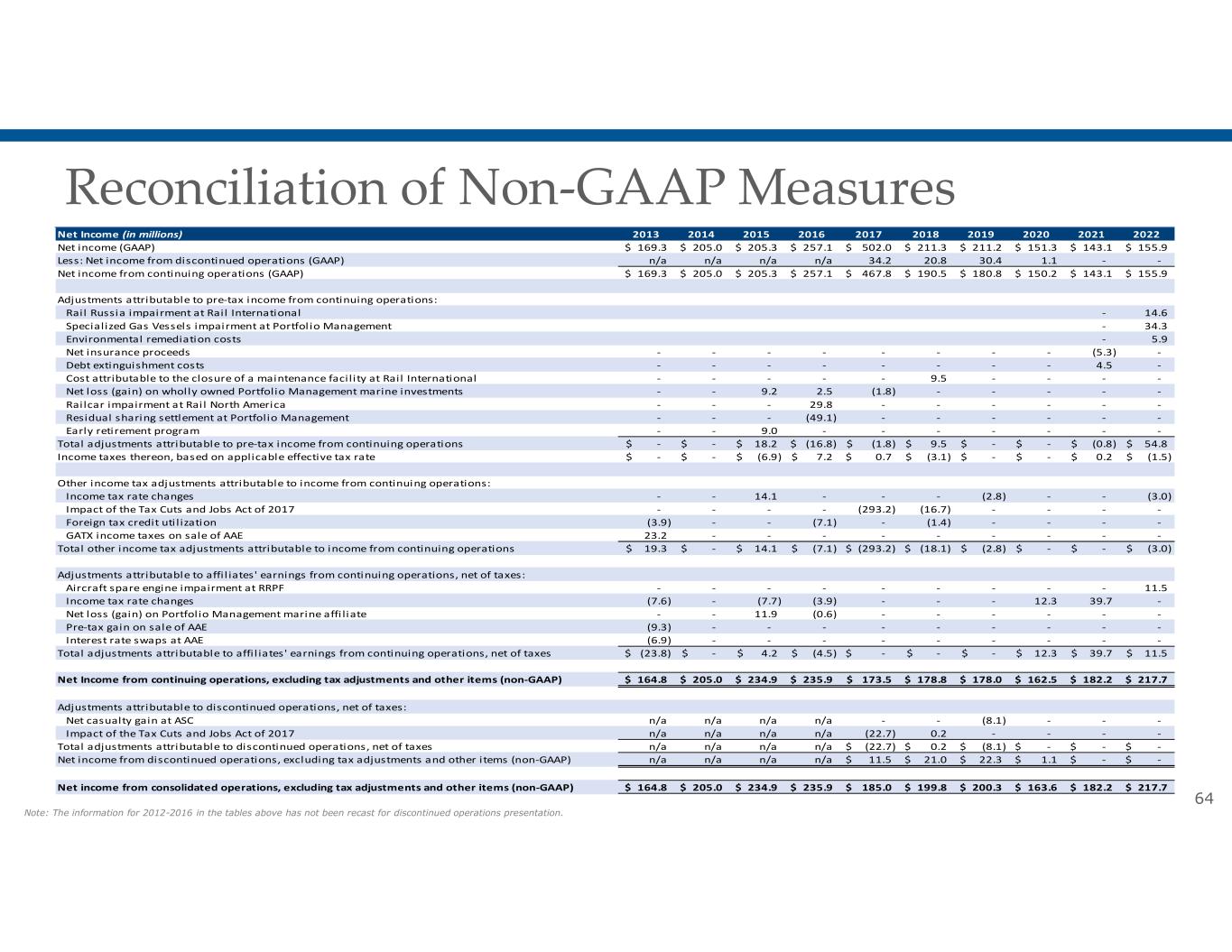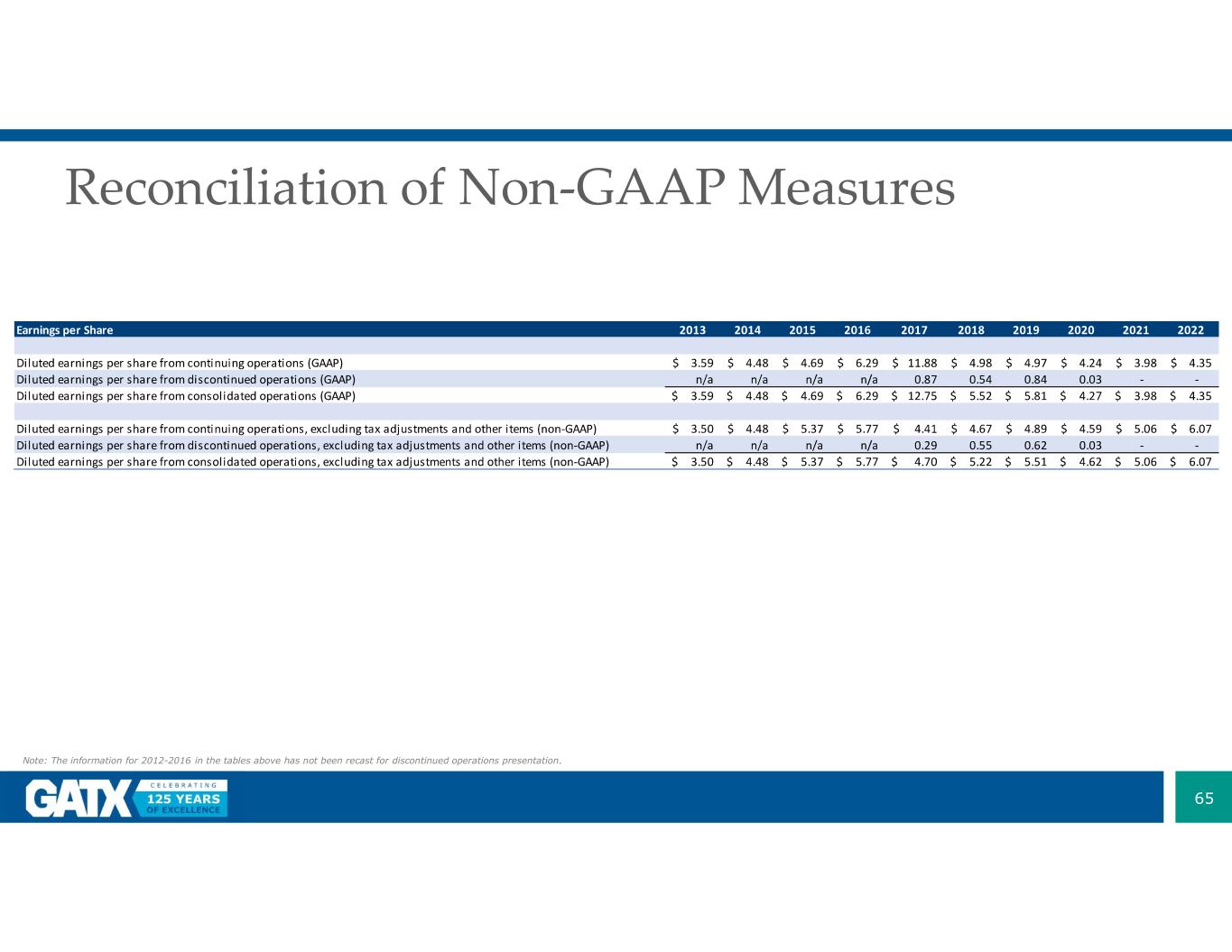 64 Net Income (in millions) 2013 2014 2015 2016 2017 2018 2019 2020 2021 2022 Net income (GAAP) 169.3$ 205.0$ 205.3$ 257.1$ 502.0$ 211.3$ 211.2$ 151.3$ 143.1$ 155.9$ Less: Net income from discontinued operations (GAAP) n/a n/a n/a n/a 34.2 20.8 30.4 1.1 - - Net income from continuing operations (GAAP) 169.3$ 205.0$ 205.3$ 257.1$ 467.8$ 190.5$ 180.8$ 150.2$ 143.1$ 155.9$ Adjustments attributable to pre-tax income from continuing operations: Rail Russia impairment at Rail International - 14.6 Specialized Gas Vessels impairment at Portfol io Management - 34.3 Environmental remediation costs - 5.9 Net insurance proceeds - - - - - - - - (5.3) - Debt extinguishment costs - - - - - - - - 4.5 - Cost attributable to the closure of a maintenance facility at Rail International - - - - - 9.5 - - - - Net loss (gain) on wholly owned Portfolio Management marine investments - - 9.2 2.5 (1.8) - - - - - Railcar impairment at Rai l North America - - - 29.8 - - - - - - Residual sharing settlement at Portfolio Management - - - (49.1) - - - - - - Early retirement program - - 9.0 - - - - - - - Total adjustments attributable to pre-tax income from continuing operations -$ -$ 18.2$ (16.8)$ (1.8)$ 9.5$ -$ -$ (0.8)$ 54.8$ Income taxes thereon, based on applicable effective tax rate -$ -$ (6.9)$ 7.2$ 0.7$ (3.1)$ -$ -$ 0.2$ (1.5)$ Other income tax adjustments attributable to income from continuing operations: Income tax rate changes - - 14.1 - - - (2.8) - - (3.0) Impact of the Tax Cuts and Jobs Act of 2017 - - - - (293.2) (16.7) - - - - Foreign tax credit uti l ization (3.9) - - (7.1) - (1.4) - - - - GATX income taxes on sale of AAE 23.2 - - - - - - - - - Total other income tax adjustments attributable to income from continuing operations 19.3$ -$ 14.1$ (7.1)$ (293.2)$ (18.1)$ (2.8)$ -$ -$ (3.0)$ Adjustments attributable to affi l iates' earnings from continuing operations, net of taxes: Aircraft spare engine impairment at RRPF - - - - - - - - - 11.5 Income tax rate changes (7.6) - (7.7) (3.9) - - - 12.3 39.7 - Net loss (gain) on Portfolio Management marine affi liate - - 11.9 (0.6) - - - - - - Pre-tax gain on sale of AAE (9.3) - - - - - - - - - Interest rate swaps at AAE (6.9) - - - - - - - - - Total adjustments attributable to affi l iates' earnings from continuing operations, net of taxes (23.8)$ -$ 4.2$ (4.5)$ -$ -$ -$ 12.3$ 39.7$ 11.5$ Net Income from continuing operations, excluding tax adjustments and other items (non-GAAP) 164.8$ 205.0$ 234.9$ 235.9$ 173.5$ 178.8$ 178.0$ 162.5$ 182.2$ 217.7$ Adjustments attributable to discontinued operations, net of taxes: Net casualty gain at ASC n/a n/a n/a n/a - - (8.1) - - - Impact of the Tax Cuts and Jobs Act of 2017 n/a n/a n/a n/a (22.7) 0.2 - - - - Total adjustments attributable to discontinued operations, net of taxes n/a n/a n/a n/a (22.7)$ 0.2$ (8.1)$ -$ -$ -$ Net income from discontinued operations, excluding tax adjustments and other items (non-GAAP) n/a n/a n/a n/a 11.5$ 21.0$ 22.3$ 1.1$ -$ -$ Net income from consolidated operations, excluding tax adjustments and other items (non-GAAP) 164.8$ 205.0$ 234.9$ 235.9$ 185.0$ 199.8$ 200.3$ 163.6$ 182.2$ 217.7$ Reconciliation of Non-GAAP Measures Note: The information for 2012-2016 in the tables above has not been recast for discontinued operations presentation.