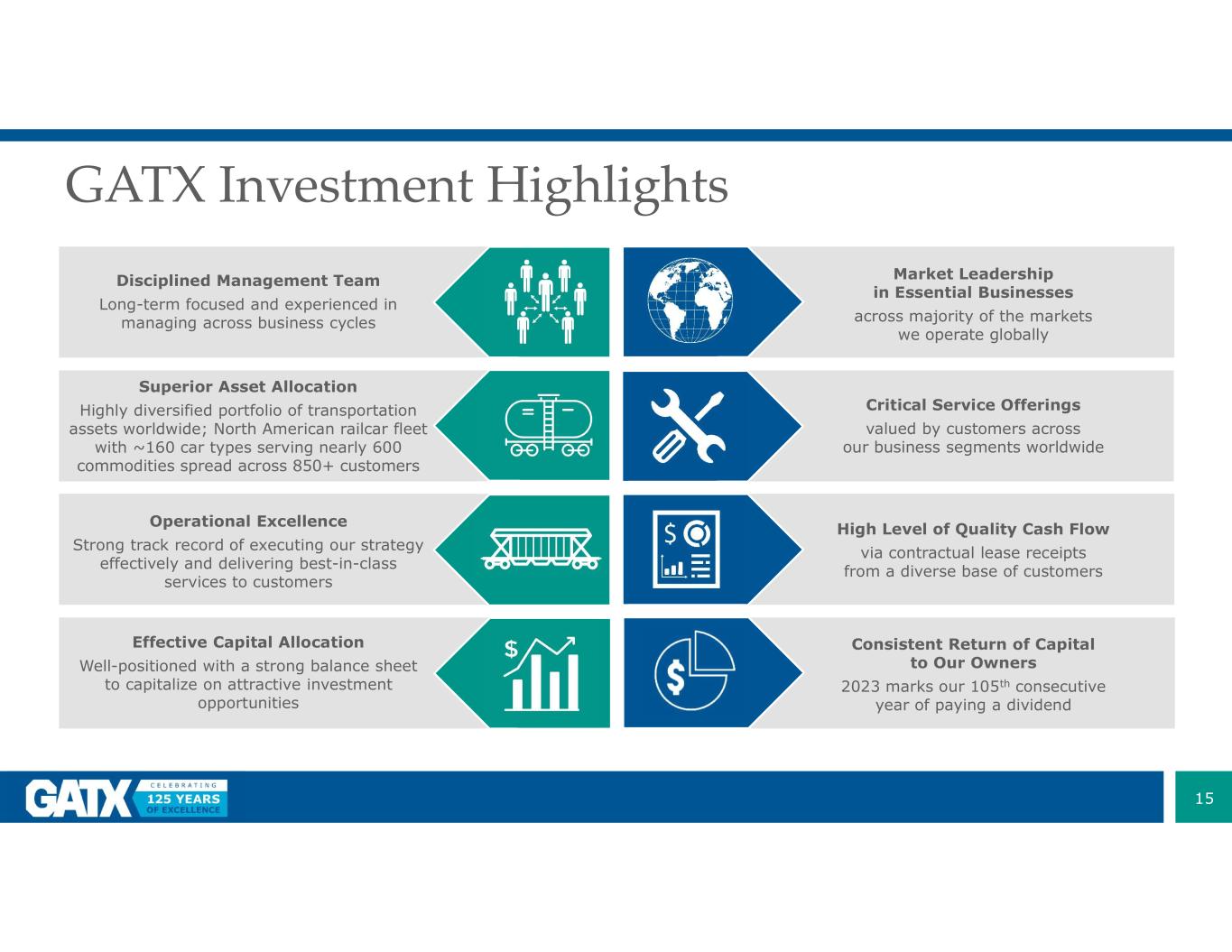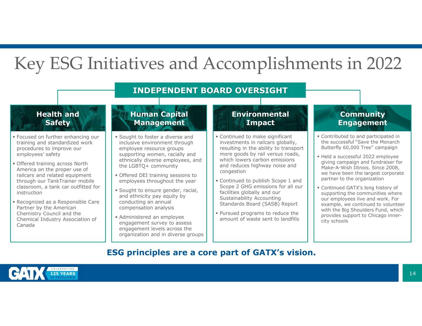 Health and Safety Human Capital Management Environmental Impact Community Engagement 14 Focused on further enhancing our training and standardized work procedures to improve our Offered training across North America on the proper use of railcars and related equipment through our TankTrainer mobile classroom, a tank car outfitted for instruction Recognized as a Responsible Care Partner by the American Chemistry Council and the Chemical Industry Association of Canada Continued to make significant investments in railcars globally, resulting in the ability to transport more goods by rail versus roads, which lowers carbon emissions and reduces highway noise and congestion Continued to publish Scope 1 and Scope 2 GHG emissions for all our facilities globally and our Sustainability Accounting Standards Board (SASB) Report Pursued programs to reduce the amount of waste sent to landfills Contributed to and participated in Held a successful 2022 employee giving campaign and fundraiser for Make-A-Wish Illinois. Since 2008, we have been the largest corporate partner to the organization supporting the communities where our employees live and work. For example, we continued to volunteer with the Big Shoulders Fund, which provides support to Chicago inner- city schools Sought to foster a diverse and inclusive environment through employee resource groups supporting women, racially and ethnically diverse employees, and the LGBTQ+ community Offered DEI training sessions to employees throughout the year Sought to ensure gender, racial, and ethnicity pay equity by conducting an annual compensation analysis Administered an employee engagement survey to assess engagement levels across the organization and in diverse groups ESG principles are a core part INDEPENDENT BOARD OVERSIGHT Key ESG Initiatives and Accomplishments in 2022