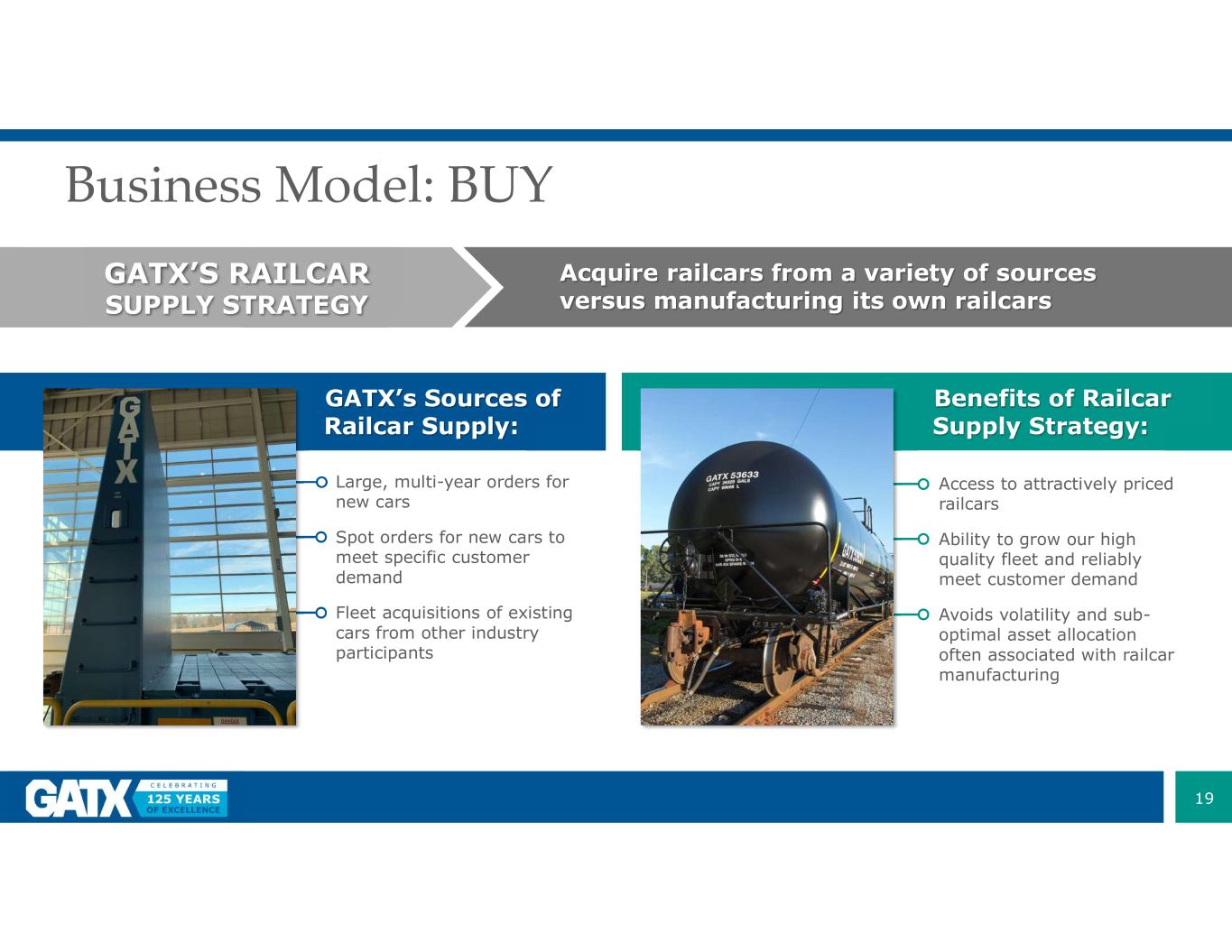 18 BEST-IN-CLASS TECHNICAL CAPABILITIES DISCIPLINED INVESTMENT APPROACH COMPETITIVE ASSET COST OPPORTUNISTIC INVESTMENT GATX places committed orders at appropriate points in the business cycle. GATX uses multiple manufacturing sources to achieve economically attractive and competitively advantaged new car costs. GATX consistently identifies attractive opportunities across the business cycle. GATX acquires railcars in the secondary market in North America and Europe on an opportunistic basis. works with customers to customize railcar specifications to meet their needs. inspections and quality control checks during the manufacturing process. $0 $200 $400 $600 $800 2013 2014 2015 2016 2017 2018 2019 2020 2021 2022 Committed Order Secondary Market Spot Order GATX North American Rail Acquisition Source GATX recognizes that railcars are long-lived assets and returns are achieved over decades. GATX avoids chasing short- term, unsustainable market trends. A D V A N T A G E Business Model: BUY