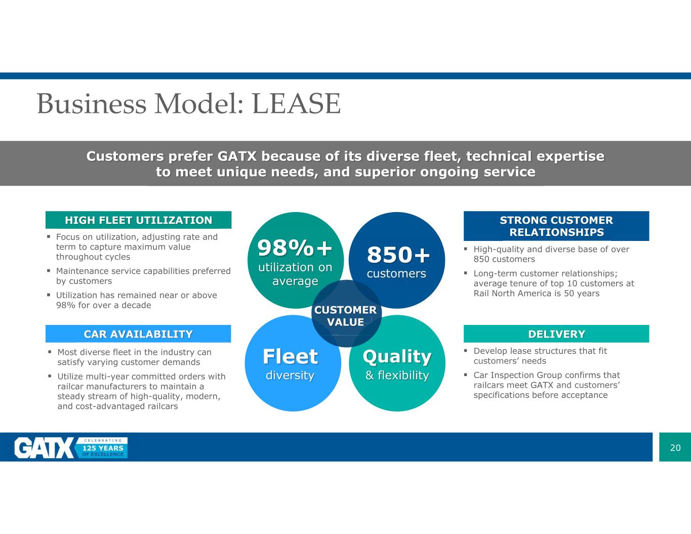 19 Railcar Supply: Benefits of Railcar Supply Strategy: Large, multi-year orders for new cars Spot orders for new cars to meet specific customer demand Fleet acquisitions of existing cars from other industry participants Access to attractively priced railcars Ability to grow our high quality fleet and reliably meet customer demand Avoids volatility and sub- optimal asset allocation often associated with railcar manufacturing Acquire railcars from a variety of sources versus manufacturing its own railcars RAILCAR SUPPLY STRATEGY Business Model: BUY