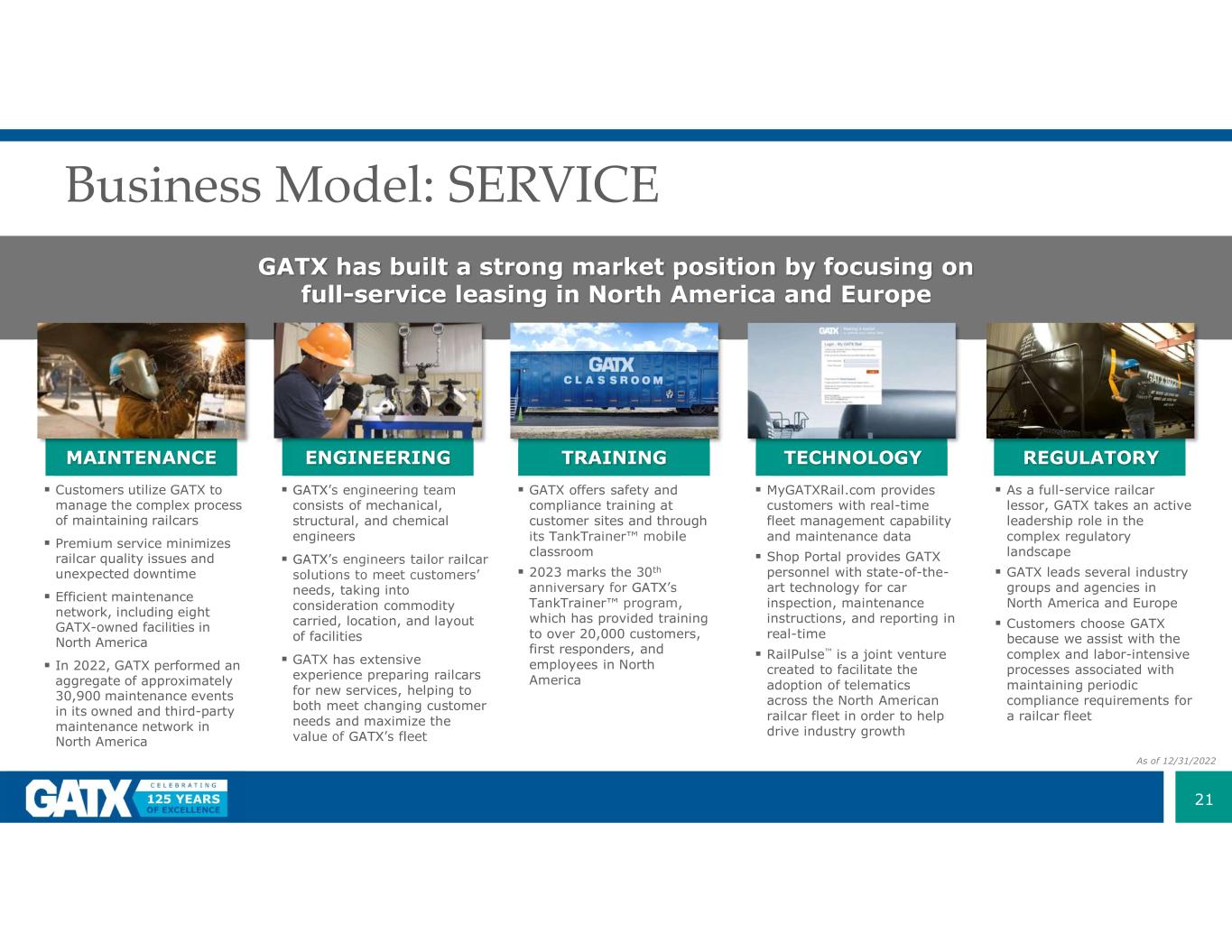 20 Most diverse fleet in the industry can satisfy varying customer demands Utilize multi-year committed orders with railcar manufacturers to maintain a steady stream of high-quality, modern, and cost-advantaged railcars Develop lease structures that fit Car Inspection Group confirms that specifications before acceptance High-quality and diverse base of over 850 customers Long-term customer relationships; average tenure of top 10 customers at Rail North America is 50 years CUSTOMER VALUE 850+ customers 98%+ utilization on average Fleet diversity Quality & flexibility HIGH FLEET UTILIZATION Focus on utilization, adjusting rate and term to capture maximum value throughout cycles Maintenance service capabilities preferred by customers Utilization has remained near or above 98% for over a decade CAR AVAILABILITY STRONG CUSTOMER RELATIONSHIPS DELIVERY Customers prefer GATX because of its diverse fleet, technical expertise to meet unique needs, and superior ongoing service Business Model: LEASE