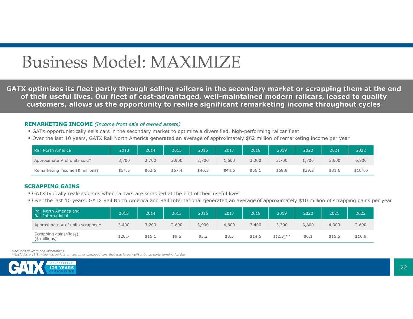 21 Customers utilize GATX to manage the complex process of maintaining railcars Premium service minimizes railcar quality issues and unexpected downtime Efficient maintenance network, including eight GATX-owned facilities in North America In 2022, GATX performed an aggregate of approximately 30,900 maintenance events in its owned and third-party maintenance network in North America consists of mechanical, structural, and chemical engineers needs, taking into consideration commodity carried, location, and layout of facilities GATX has extensive experience preparing railcars for new services, helping to both meet changing customer needs and maximize the GATX offers safety and compliance training at customer sites and through classroom 2023 marks the 30th TankTrainer which has provided training to over 20,000 customers, first responders, and employees in North America MyGATXRail.com provides customers with real-time fleet management capability and maintenance data Shop Portal provides GATX personnel with state-of-the- art technology for car inspection, maintenance instructions, and reporting in real-time RailPulse is a joint venture created to facilitate the adoption of telematics across the North American railcar fleet in order to help drive industry growth As a full-service railcar lessor, GATX takes an active leadership role in the complex regulatory landscape GATX leads several industry groups and agencies in North America and Europe Customers choose GATX because we assist with the complex and labor-intensive processes associated with maintaining periodic compliance requirements for a railcar fleet As of 12/31/2022 MAINTENANCE ENGINEERING TRAINING TECHNOLOGY REGULATORY GATX has built a strong market position by focusing on full-service leasing in North America and Europe Business Model: SERVICE