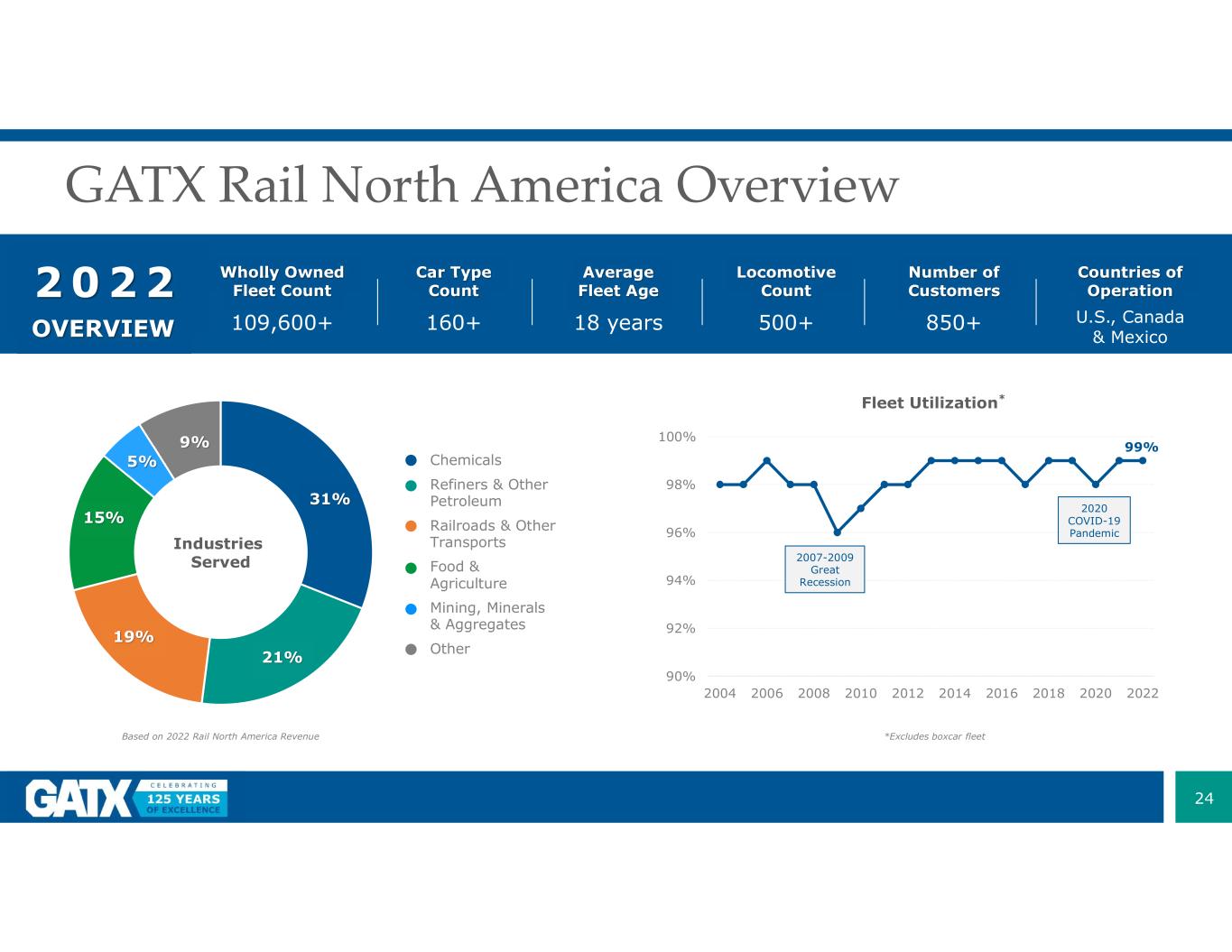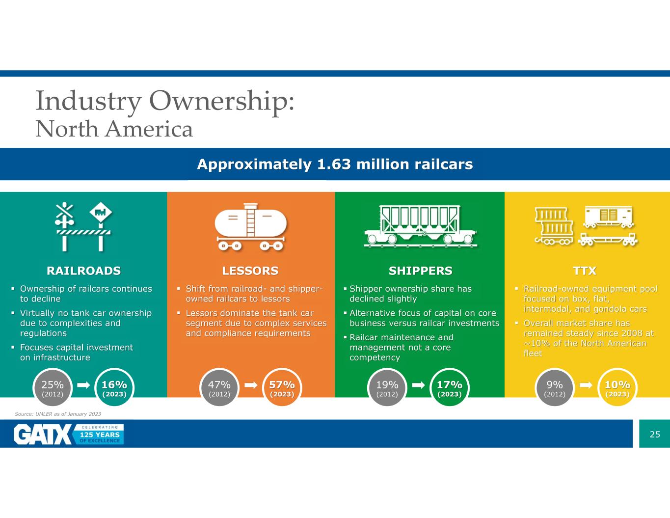24 2 0 2 2 Wholly Owned Fleet Count Car Type Count Average Fleet Age Locomotive Count Number of Customers Countries of Operation 109,600+ 160+ 18 years 500+ 850+ U.S., Canada & Mexico Chemicals Refiners & Other Petroleum Railroads & Other Transports Food & Agriculture Mining, Minerals & Aggregates Other Based on 2022 Rail North America Revenue 31% 21% 19% 15% 5% 9% Industries Served *Excludes boxcar fleet 90% 92% 94% 96% 98% 100% 2004 2006 2008 2010 2012 2014 2016 2018 2020 2022 Fleet Utilization* 99% OVERVIEW GATX Rail North America Overview 2007-2009 Great Recession 2020 COVID-19 Pandemic