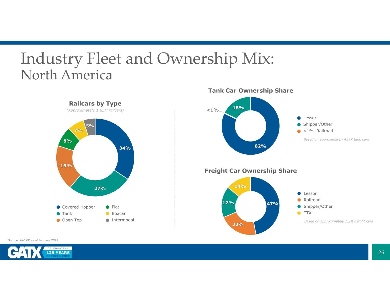 Approximately 1.63 million railcars 25 Source: UMLER as of January 2023 RAILROADS Ownership of railcars continues to decline Virtually no tank car ownership due to complexities and regulations Focuses capital investment on infrastructure 16% (2023) 57% (2023) 17% (2023) 10% (2023) LESSORS Shift from railroad- and shipper- owned railcars to lessors Lessors dominate the tank car segment due to complex services and compliance requirements SHIPPERS Shipper ownership share has declined slightly Alternative focus of capital on core business versus railcar investments Railcar maintenance and management not a core competency TTX Railroad-owned equipment pool focused on box, flat, intermodal, and gondola cars Overall market share has remained steady since 2008 at ~10% of the North American fleet 25% (2012) 47% (2012) 19% (2012) 9% (2012) Industry Ownership: North America