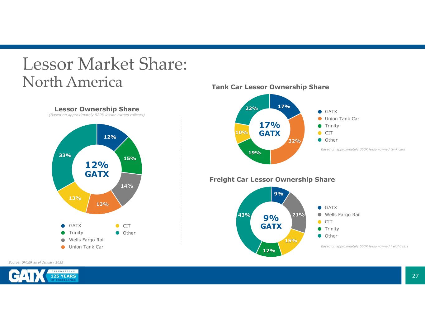 26 Covered Hopper Tank Open Top Flat Boxcar Intermodal Based on approximately 439K tank cars Based on approximately 1.2M freight cars 47% 22% 17% 14% Lessor Railroad Shipper/Other TTX 34% 27% 19% 8% 7% 5% 82% <1% 18% Lessor Shipper/Other <1% Railroad Railcars by Type (Approximately 1.63M railcars) Tank Car Ownership Share Freight Car Ownership Share Source: UMLER as of January 2023 Industry Fleet and Ownership Mix: North America