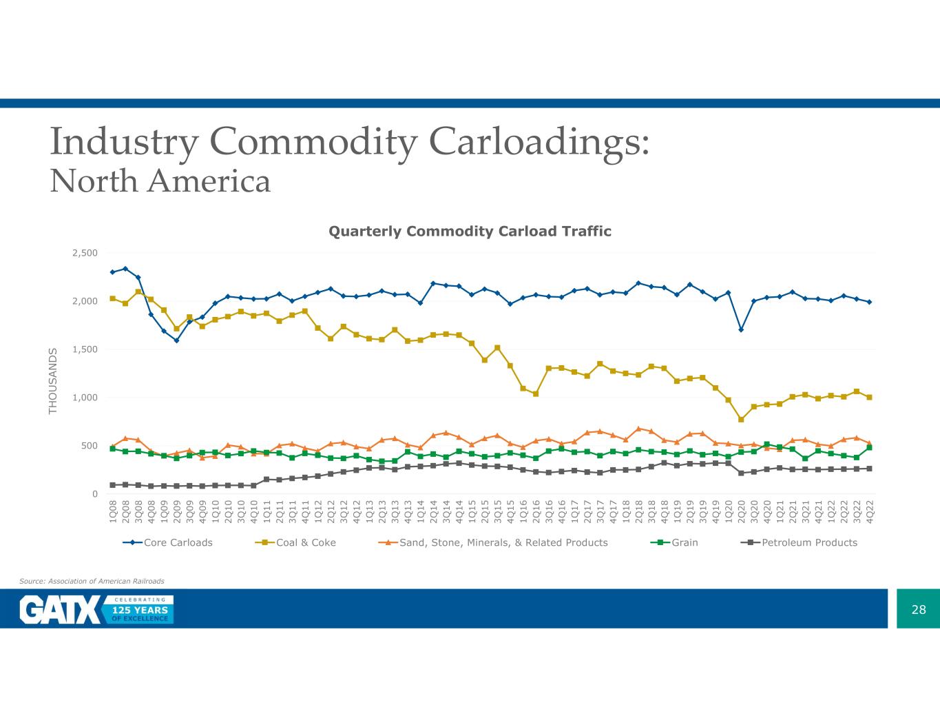 9% 21% 15% 12% 43% 27 Based on approximately 360K lessor-owned tank cars Based on approximately 560K lessor-owned freight cars Lessor Ownership Share (Based on approximately 920K lessor-owned railcars) Tank Car Lessor Ownership Share Freight Car Lessor Ownership Share Source: UMLER as of January 2023 12% 15% 14% 13% 13% 33% 12% GATX GATX Trinity Wells Fargo Rail Union Tank Car CIT Other 17% 32% 19% 10% 22% 17% GATX GATX Union Tank Car Trinity CIT Other GATX Wells Fargo Rail CIT Trinity Other 9% GATX Lessor Market Share: North America