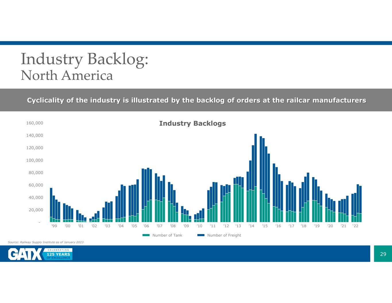 29 Source: Railway Supply Institute as of January 2023 Number of Tank Number of Freight - 20,000 40,000 60,000 80,000 100,000 120,000 140,000 160,000 Industry Backlogs Cyclicality of the industry is illustrated by the backlog of orders at the railcar manufacturers Industry Backlog: North America