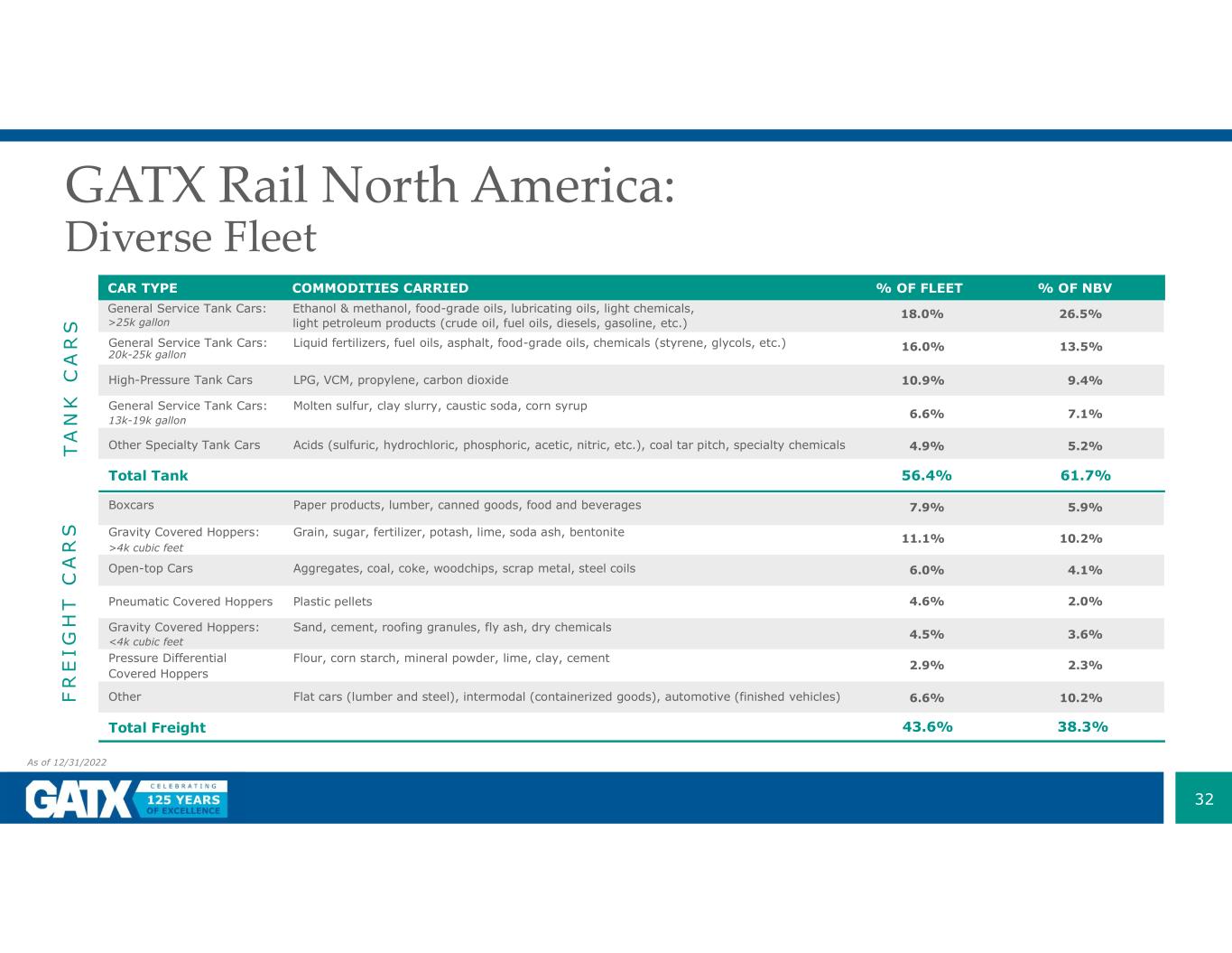 31 GATX serves more than 850 individual customers Top 20 customers account for less than 35% of total lease revenue Average relationship tenure of top 10 customers is 50 years Largest customer represents less than 5% of total lease revenue 60% 8% 32% Credit Ratings of the Top 50 Customer Families Investment Grade BB+ or Lower Private / Not Rated Note: Top 20 customers based on 2022 revenue; Customer families sometimes include more than one customer account; the ratings noted generally reflect the credit quality of the rated parent entity. Lease obligations of subsidiaries are not necessarily guaranteed by the rated parent entity. As of 12/31/2022 GATX Rail North America: Diverse Customer Portfolio