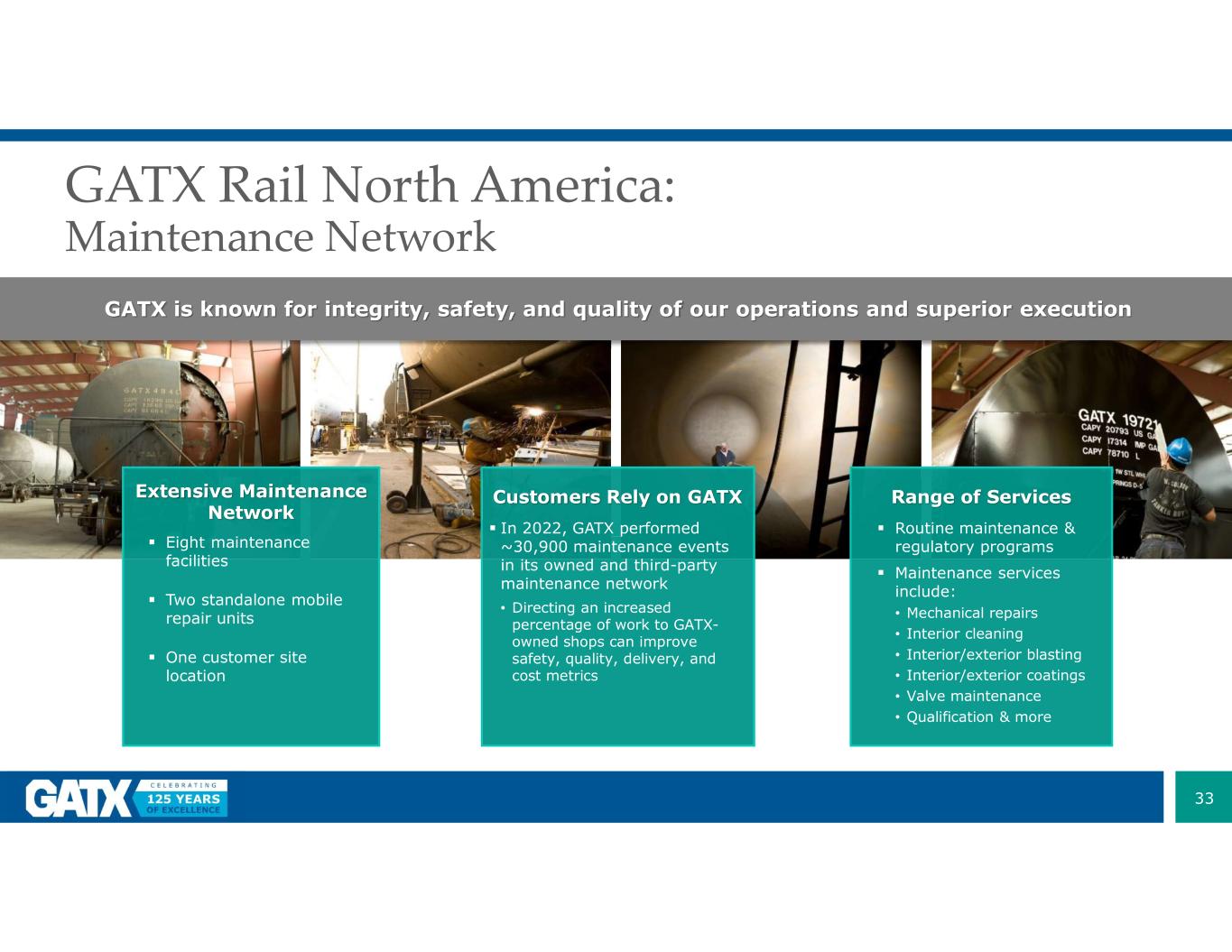 32 CAR TYPE COMMODITIES CARRIED % OF FLEET % OF NBV High-Pressure Tank Cars LPG, VCM, propylene, carbon dioxide General Service Tank Cars: Molten sulfur, clay slurry, caustic soda, corn syrup 13k-19k gallon Other Specialty Tank Cars Acids (sulfuric, hydrochloric, phosphoric, acetic, nitric, etc.), coal tar pitch, specialty chemicals Total Tank Boxcars Paper products, lumber, canned goods, food and beverages Pneumatic Covered Hoppers Plastic pellets Gravity Covered Hoppers: Sand, cement, roofing granules, fly ash, dry chemicals <4k cubic feet Pressure Differential Flour, corn starch, mineral powder, lime, clay, cement Covered Hoppers Other Flat cars (lumber and steel), intermodal (containerized goods), automotive (finished vehicles) Total Freight General Service Tank Cars: Liquid fertilizers, fuel oils, asphalt, food-grade oils, chemicals (styrene, glycols, etc.) 20k-25k gallon 16.0% 13.5% General Service Tank Cars: Ethanol & methanol, food-grade oils, lubricating oils, light chemicals, >25k gallon light petroleum products (crude oil, fuel oils, diesels, gasoline, etc.) 18.0% 26.5% 10.9% 9.4% 6.6% 7.1% 4.9% 5.2% 56.4% 61.7% 7.9% 5.9% Open-top Cars Aggregates, coal, coke, woodchips, scrap metal, steel coils 6.0% 4.1% Gravity Covered Hoppers: Grain, sugar, fertilizer, potash, lime, soda ash, bentonite >4k cubic feet 11.1% 10.2% 4.6% 2.0% 4.5% 3.6% 2.9% 2.3% 6.6% 10.2% 43.6% 38.3% As of 12/31/2022 GATX Rail North America: Diverse Fleet
