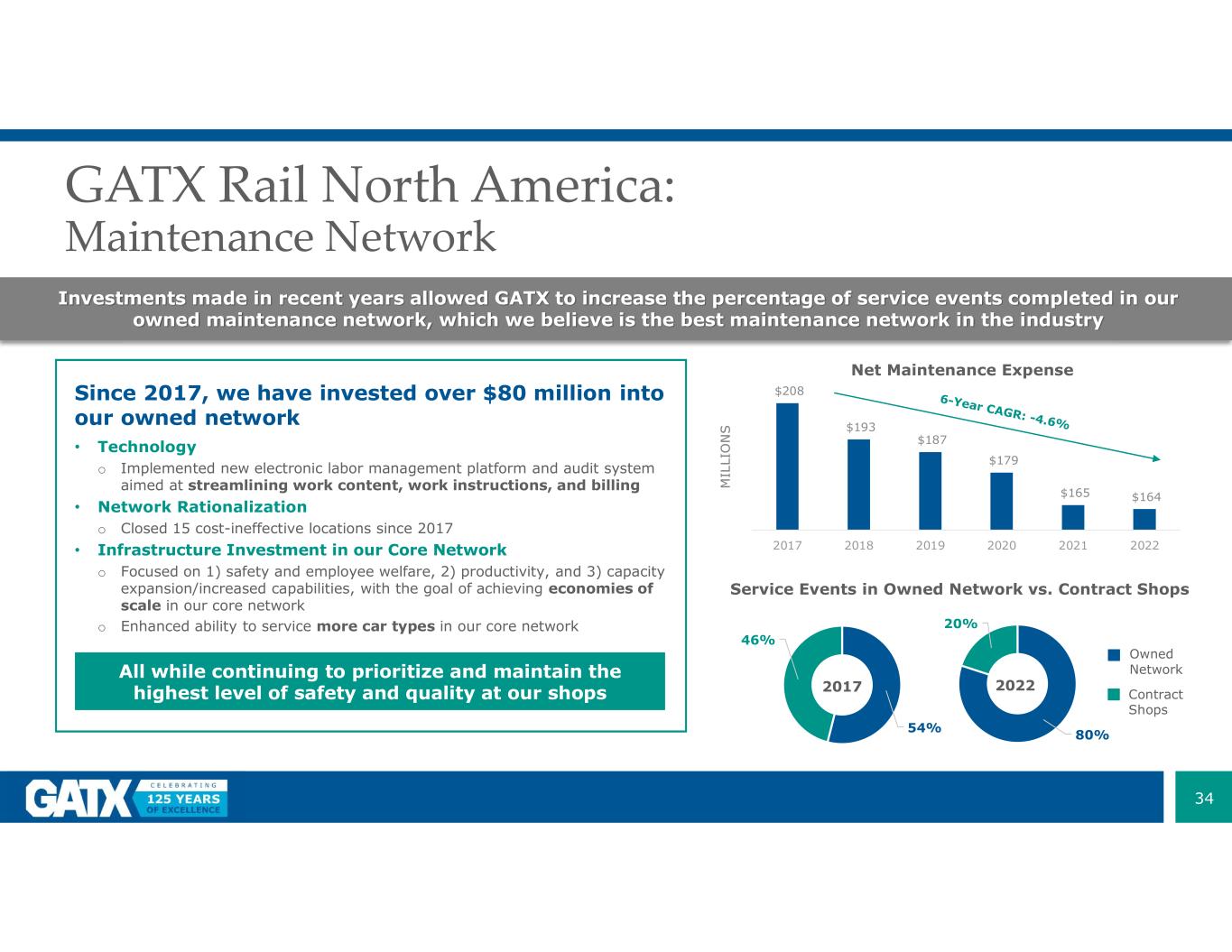 33 Eight maintenance facilities Two standalone mobile repair units One customer site location In 2022, GATX performed ~30,900 maintenance events in its owned and third-party maintenance network Directing an increased percentage of work to GATX- owned shops can improve safety, quality, delivery, and cost metrics Routine maintenance & regulatory programs Maintenance services include: Mechanical repairs Interior cleaning Interior/exterior blasting Interior/exterior coatings Valve maintenance Qualification & more GATX is known for integrity, safety, and quality of our operations and superior execution Range of ServicesCustomers Rely on GATXExtensive Maintenance Network GATX Rail North America: Maintenance Network