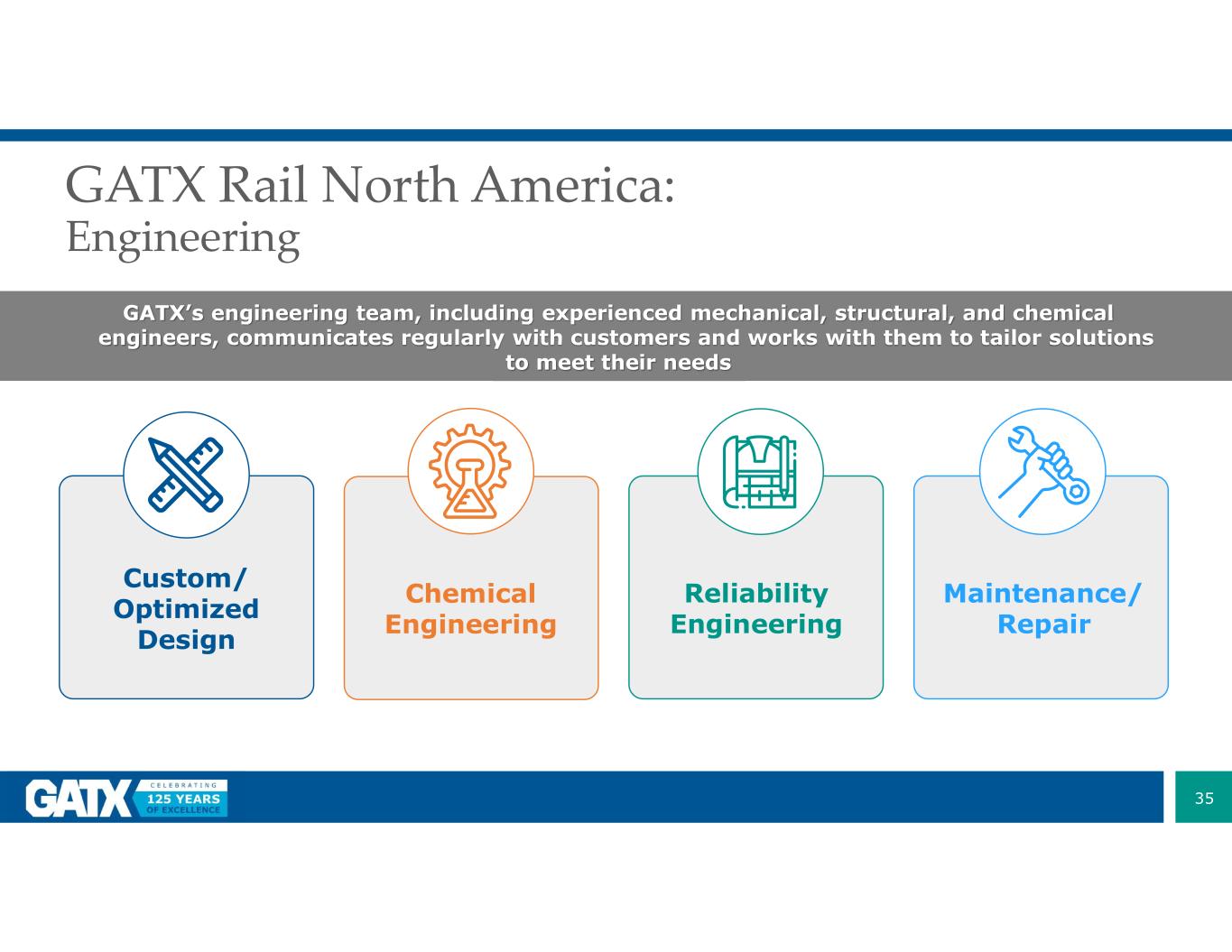 35 including experienced mechanical, structural, and chemical engineers, communicates regularly with customers and works with them to tailor solutions to meet their needs Custom/ Optimized Design Chemical Engineering Reliability Engineering Maintenance/ Repair GATX Rail North America: Engineering