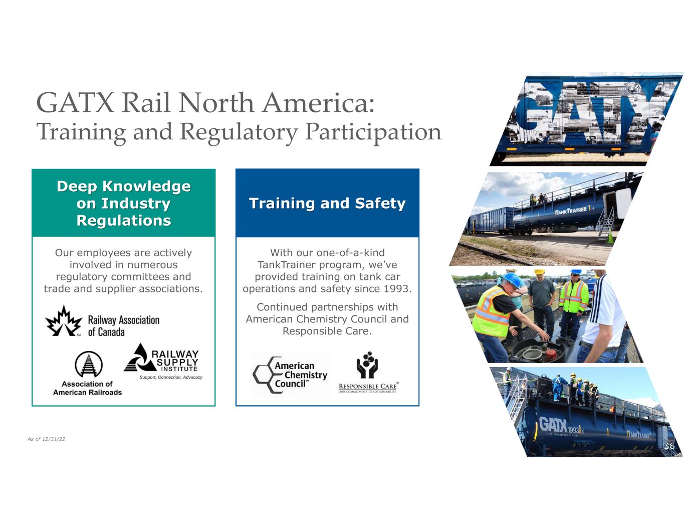 3636 GATX Rail North America: Training and Regulatory Participation As of 12/31/22 Training and Safety With our one-of-a-kind TankTrainer provided training on tank car operations and safety since 1993. Continued partnerships with American Chemistry Council and Responsible Care. Our employees are actively involved in numerous regulatory committees and trade and supplier associations. Deep Knowledge on Industry Regulations