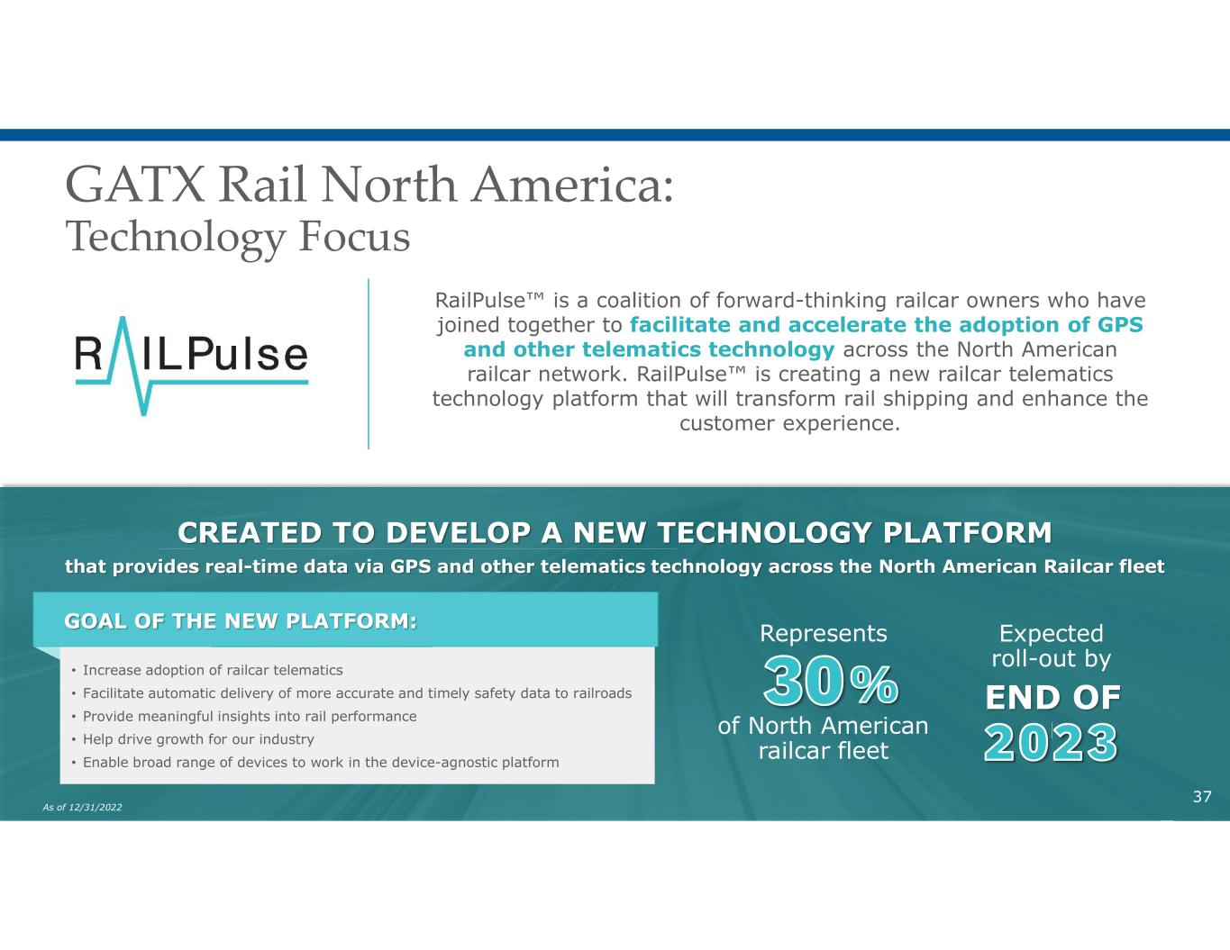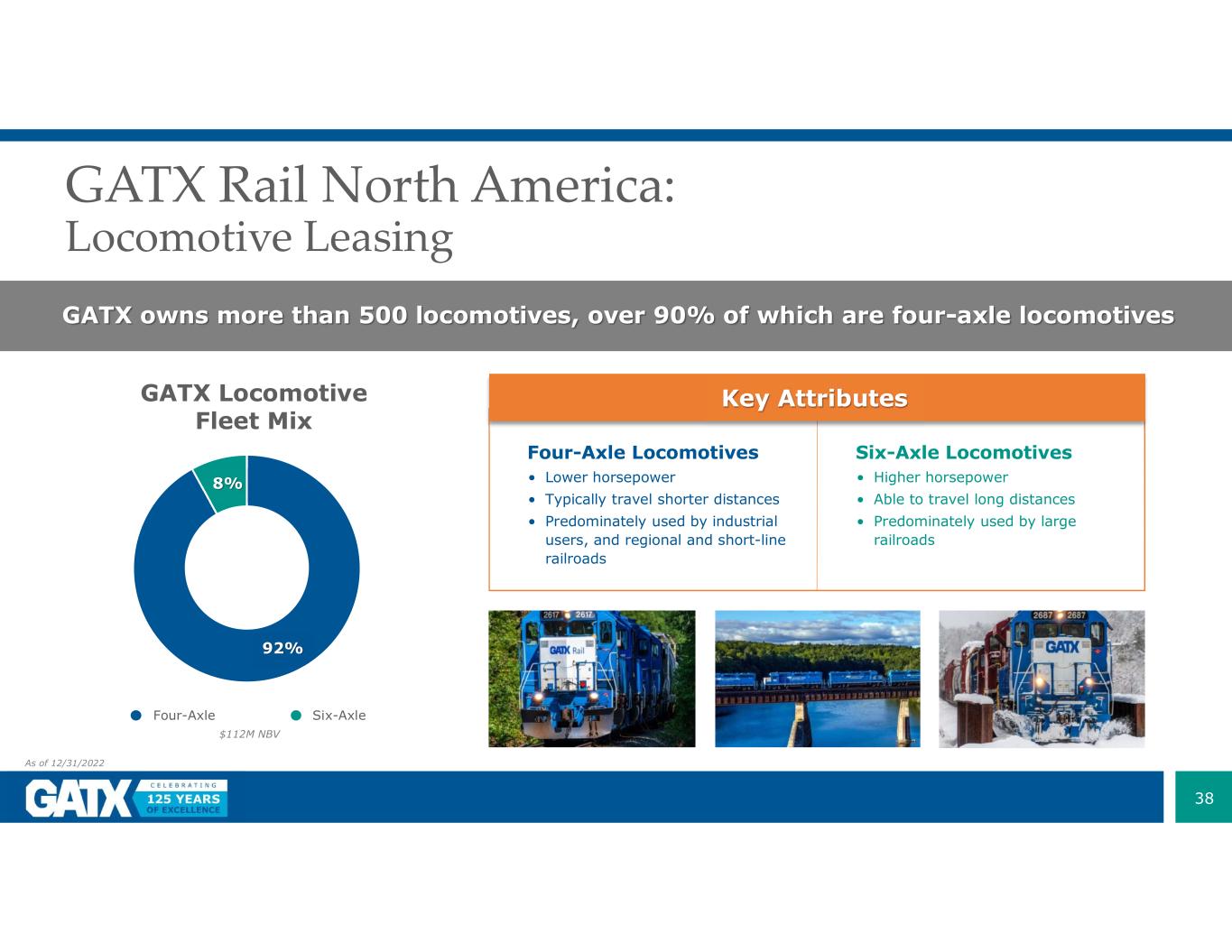 RailPulse -thinking railcar owners who have joined together to facilitate and accelerate the adoption of GPS and other telematics technology across the North American railcar network. RailPulse technology platform that will transform rail shipping and enhance the customer experience. 37 GOAL OF THE NEW PLATFORM: Increase adoption of railcar telematics Facilitate automatic delivery of more accurate and timely safety data to railroads Provide meaningful insights into rail performance Help drive growth for our industry Enable broad range of devices to work in the device-agnostic platform CREATED TO DEVELOP A NEW TECHNOLOGY PLATFORM that provides real-time data via GPS and other telematics technology across the North American Railcar fleet of North American railcar fleet Represents END OF Expected roll-out by GATX Rail North America: Technology Focus As of 12/31/2022