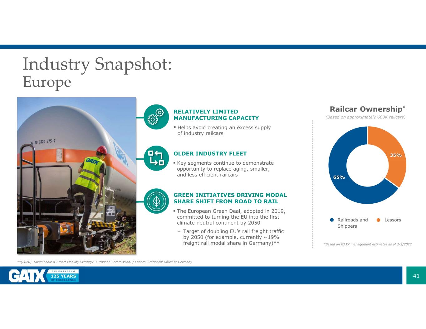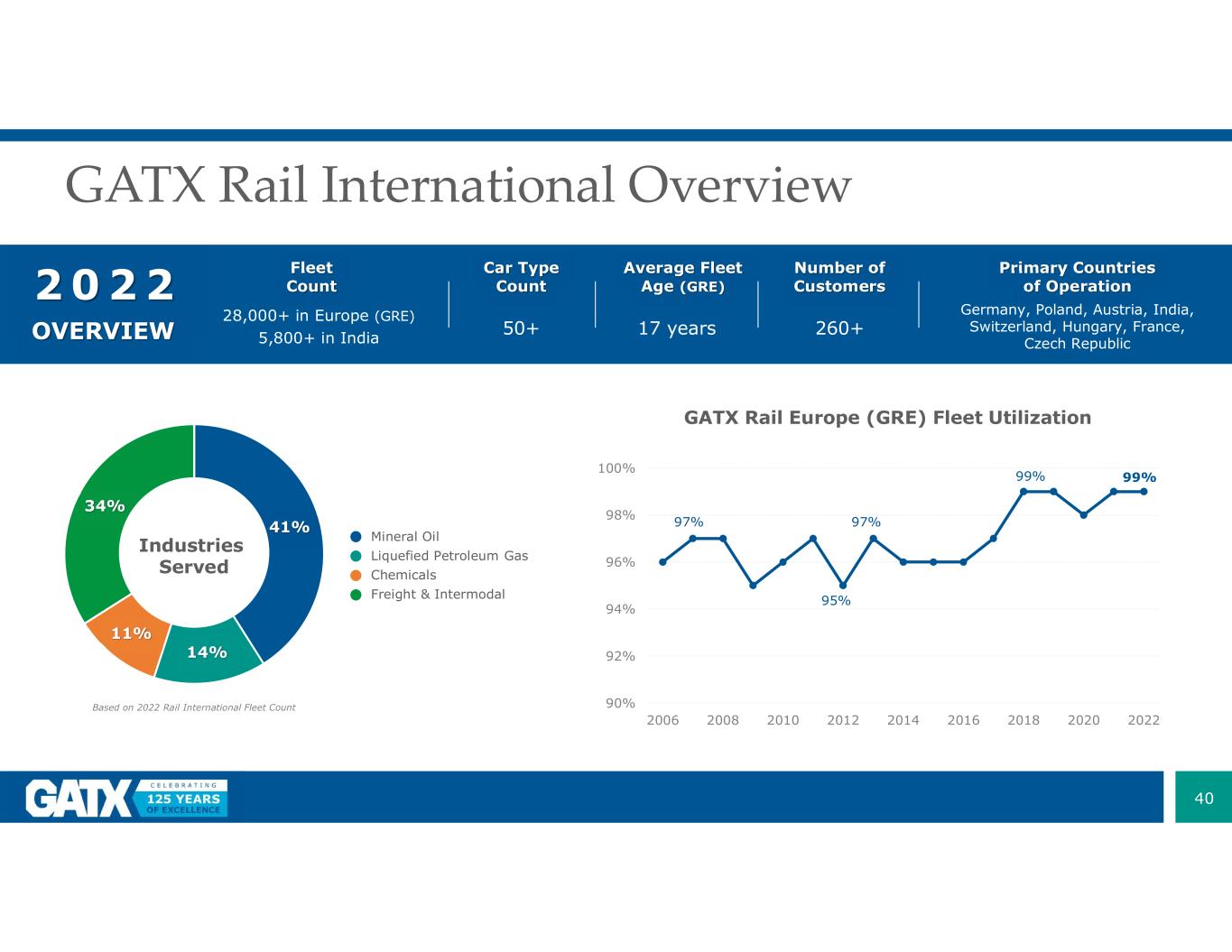 40 Fleet Count Car Type Count Average Fleet Age (GRE) Number of Customers Primary Countries of Operation 28,000+ in Europe (GRE) 5,800+ in India 50+ 17 years 260+ Germany, Poland, Austria, India, Switzerland, Hungary, France, Czech Republic 2 0 2 2 OVERVIEW 41% 14% 11% 34% Based on 2022 Rail International Fleet Count Industries Served 97% 95% 97% 99% 99% 90% 92% 94% 96% 98% 100% 2006 2008 2010 2012 2014 2016 2018 2020 2022 GATX Rail Europe (GRE) Fleet Utilization Mineral Oil Liquefied Petroleum Gas Chemicals Freight & Intermodal GATX Rail International Overview