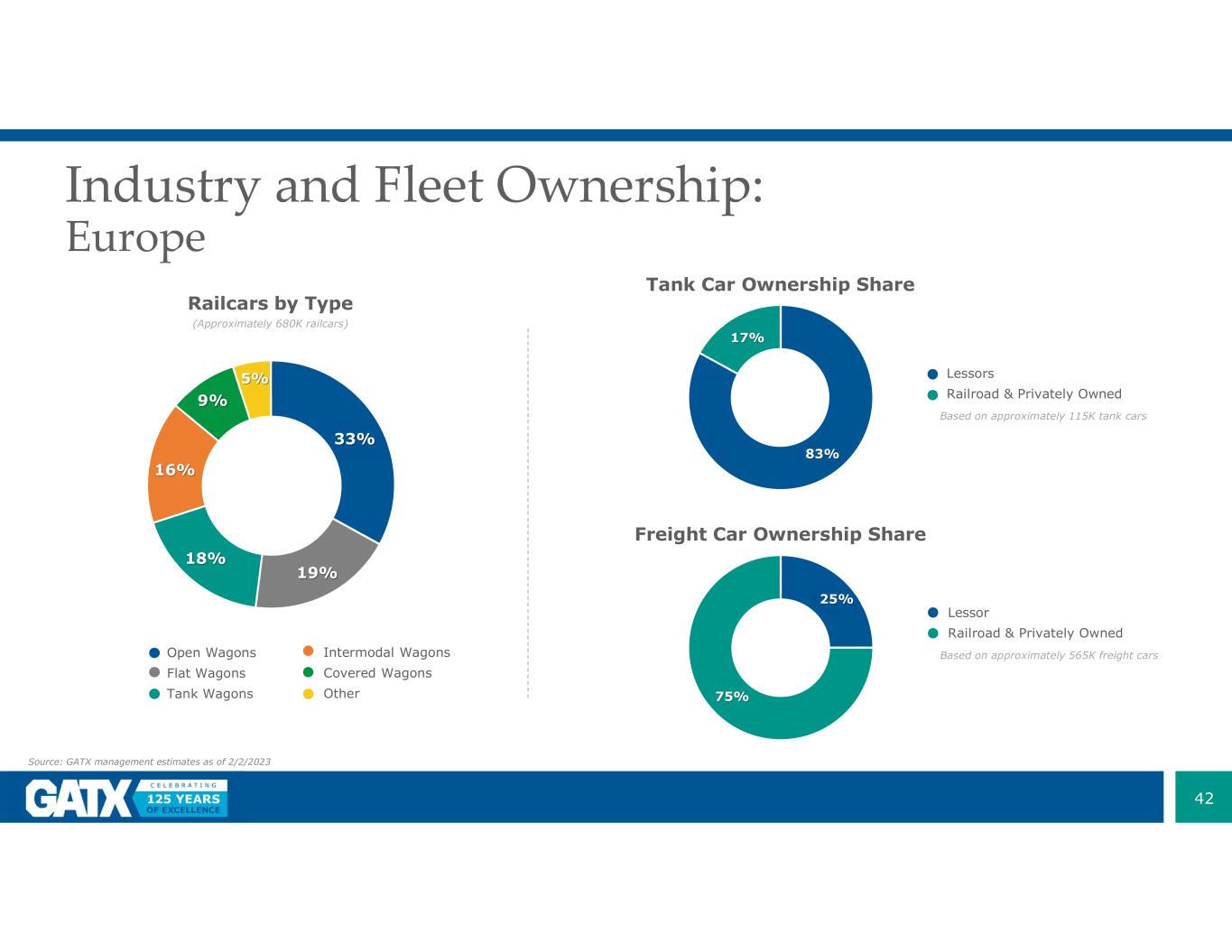 41 35% 65% Railcar Ownership* Railroads and Shippers Lessors RELATIVELY LIMITED MANUFACTURING CAPACITY Helps avoid creating an excess supply of industry railcars OLDER INDUSTRY FLEET Key segments continue to demonstrate opportunity to replace aging, smaller, and less efficient railcars GREEN INITIATIVES DRIVING MODAL SHARE SHIFT FROM ROAD TO RAIL The European Green Deal, adopted in 2019, committed to turning the EU into the first climate neutral continent by 2050 by 2050 (for example, currently ~19% freight rail modal share in Germany)** *Based on GATX management estimates as of 2/2/2023 Industry Snapshot: Europe **(2020). Sustainable & Smart Mobility Strategy. European Commission. / Federal Statistical Office of Germany (Based on approximately 680K railcars)