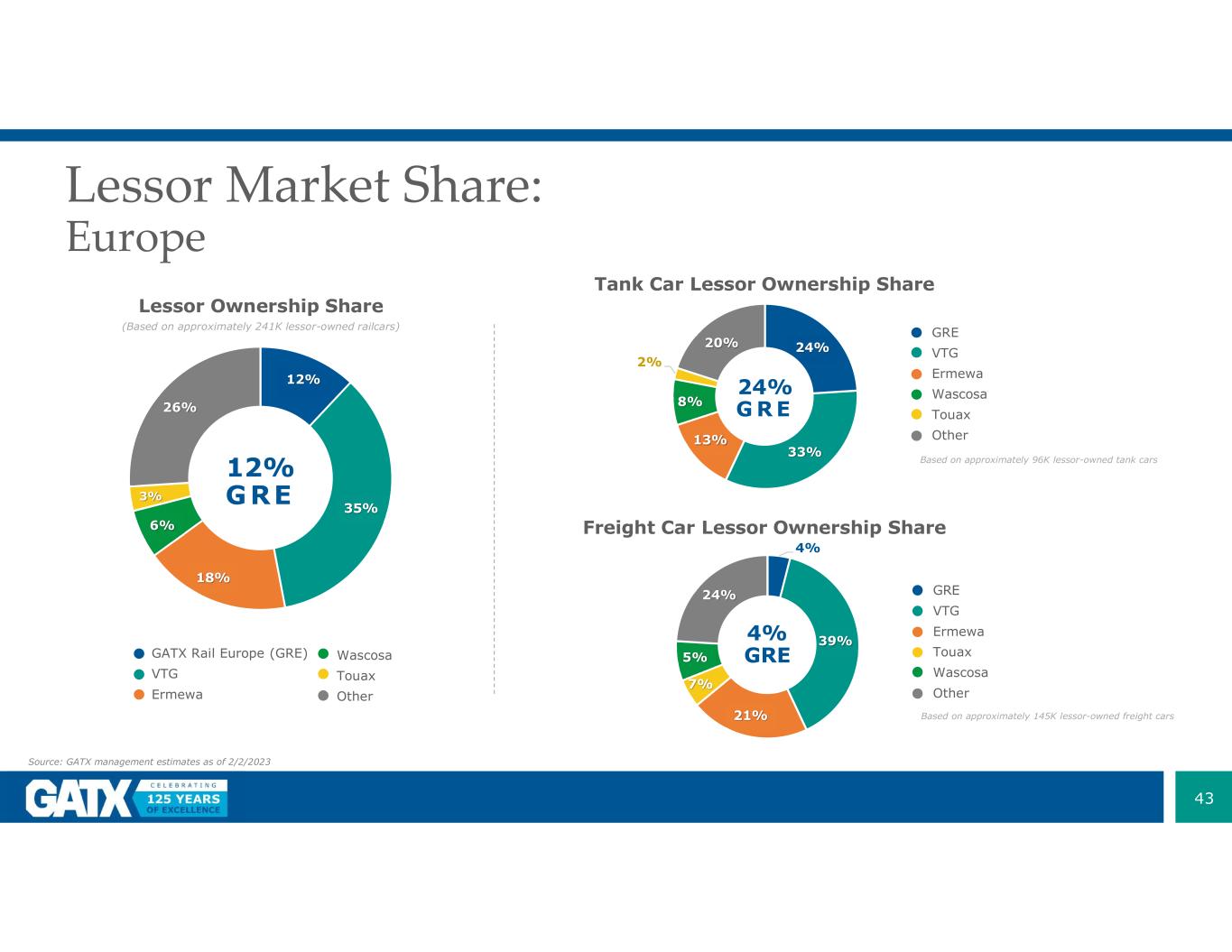 42 Lessor Railroad & Privately Owned 25% 75% 83% 17% 33% 19% 18% 16% 9% 5% Open Wagons Flat Wagons Tank Wagons Intermodal Wagons Covered Wagons Other Lessors Railroad & Privately Owned Railcars by Type (Approximately 680K railcars) Tank Car Ownership Share Freight Car Ownership Share Based on approximately 115K tank cars Based on approximately 565K freight cars Source: GATX management estimates as of 2/2/2023 Industry and Fleet Ownership: Europe