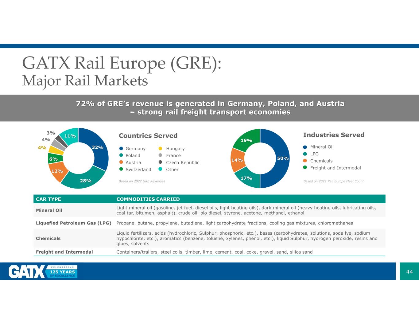 4% 39% 21% 7% 5% 24% 24% 33% 13% 8% 2% 20% 43 GRE VTG Ermewa Touax Wascosa Other GRE VTG Ermewa Wascosa Touax Other 12% 35% 18% 6% 3% 26% GATX Rail Europe (GRE) VTG Ermewa Wascosa Touax Other Based on approximately 96K lessor-owned tank cars Based on approximately 145K lessor-owned freight cars Lessor Ownership Share (Based on approximately 241K lessor-owned railcars) Tank Car Lessor Ownership Share Freight Car Lessor Ownership Share 12% GRE 24% G R E 4% GRE Lessor Market Share: Europe Source: GATX management estimates as of 2/2/2023