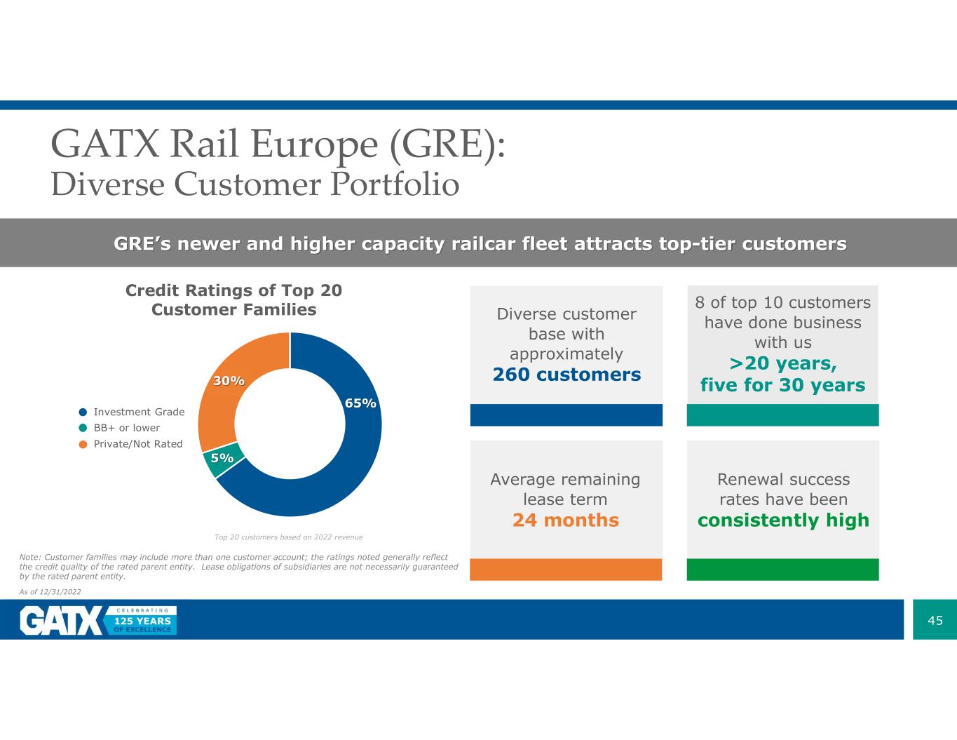 44 CAR TYPE COMMODITIES CARRIED Mineral Oil Light mineral oil (gasoline, jet fuel, diesel oils, light heating oils), dark mineral oil (heavy heating oils, lubricating oils, coal tar, bitumen, asphalt), crude oil, bio diesel, styrene, acetone, methanol, ethanol Liquefied Petroleum Gas (LPG) Propane, butane, propylene, butadiene, light carbohydrate fractions, cooling gas mixtures, chloromethanes Chemicals Liquid fertilizers, acids (hydrochloric, Sulphur, phosphoric, etc.), bases (carbohydrates, solutions, soda lye, sodium hypochlorite, etc.), aromatics (benzene, toluene, xylenes, phenol, etc.), liquid Sulphur, hydrogen peroxide, resins and glues, solvents Freight and Intermodal Containers/trailers, steel coils, timber, lime, cement, coal, coke, gravel, sand, silica sand 32% 28% 12% 6% 4% 4% 3% 11% Based on 2022 Rail Europe Fleet CountBased on 2022 GRE Revenues 50% 17% 14% 19% Countries Served Germany Poland Austria Switzerland Hungary France Czech Republic Other Industries Served Mineral Oil LPG Chemicals Freight and Intermodal , Poland, and Austria strong rail freight transport economies GATX Rail Europe (GRE): Major Rail Markets