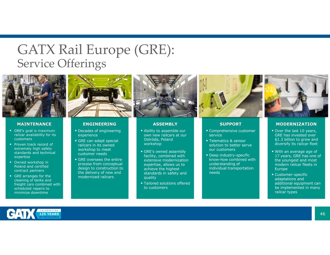 46 MAINTENANCE railcar availability for its customers Proven track record of extremely high safety standards and technical expertise Owned workshop in Poland and certified contract partners GRE arranges for the cleaning of tanks and freight cars combined with scheduled repairs to minimize downtime ENGINEERING Decades of engineering experience GRE can adapt special railcars in its owned workshop to meet customer needs GRE oversees the entire process from conceptual design to construction to the delivery of new and modernized railcars ASSEMBLY Ability to assemble our own new railcars at our Ostróda, Poland workshop facility, combined with extensive modernization expertise, allows us to achieve the highest standards in safety and quality Tailored solutions offered to customers SUPPORT Comprehensive customer service Telematics & sensor solution to better serve our customers Deep industry-specific know-how combined with understanding of individual transportation needs MODERNIZATION Over the last 10 years, GRE has invested over $1.3 billion to grow and diversify its railcar fleet With an average age of 17 years, GRE has one of the youngest and most modern railcar fleets in Europe Customer-specific adaptations and additional equipment can be implemented in many railcar types GATX Rail Europe (GRE): Service Offerings
