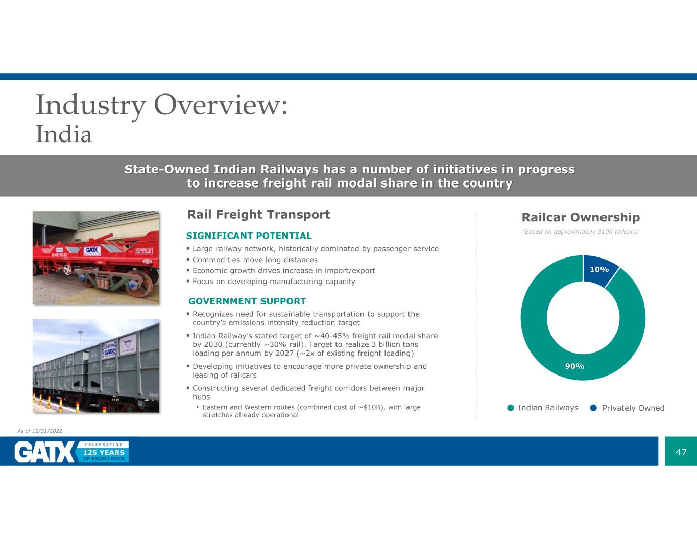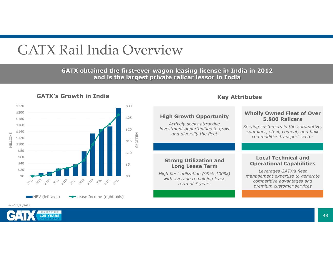 48 $0 $5 $10 $15 $20 $25 $30 $0 $20 $40 $60 $80 $100 $120 $140 $160 $180 $200 $220 NBV (left axis) Lease Income (right axis) Key Attributes Local Technical and Operational Capabilities management expertise to generate competitive advantages and premium customer services Wholly Owned Fleet of Over 5,800 Railcars Serving customers in the automotive, container, steel, cement, and bulk commodities transport sector Strong Utilization and Long Lease Term High fleet utilization (99%-100%) with average remaining lease term of 5 years High Growth Opportunity Actively seeks attractive investment opportunities to grow and diversify the fleet GATX obtained the first-ever wagon leasing license in India in 2012 and is the largest private railcar lessor in India GATX Rail India Overview As of 12/31/2022