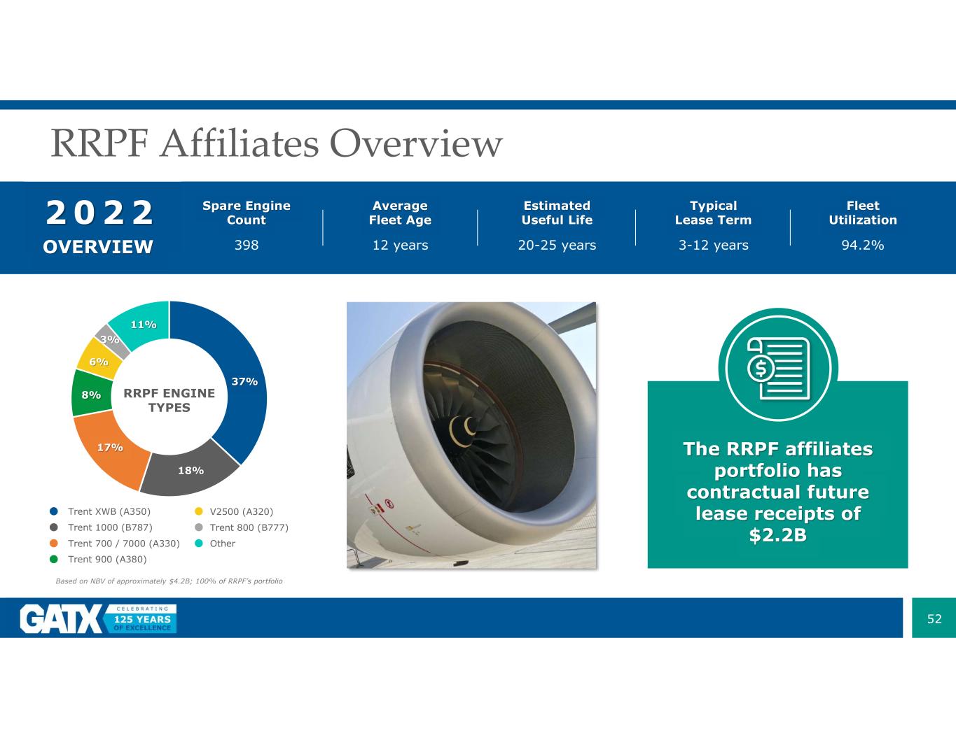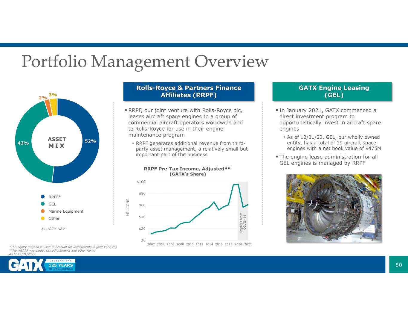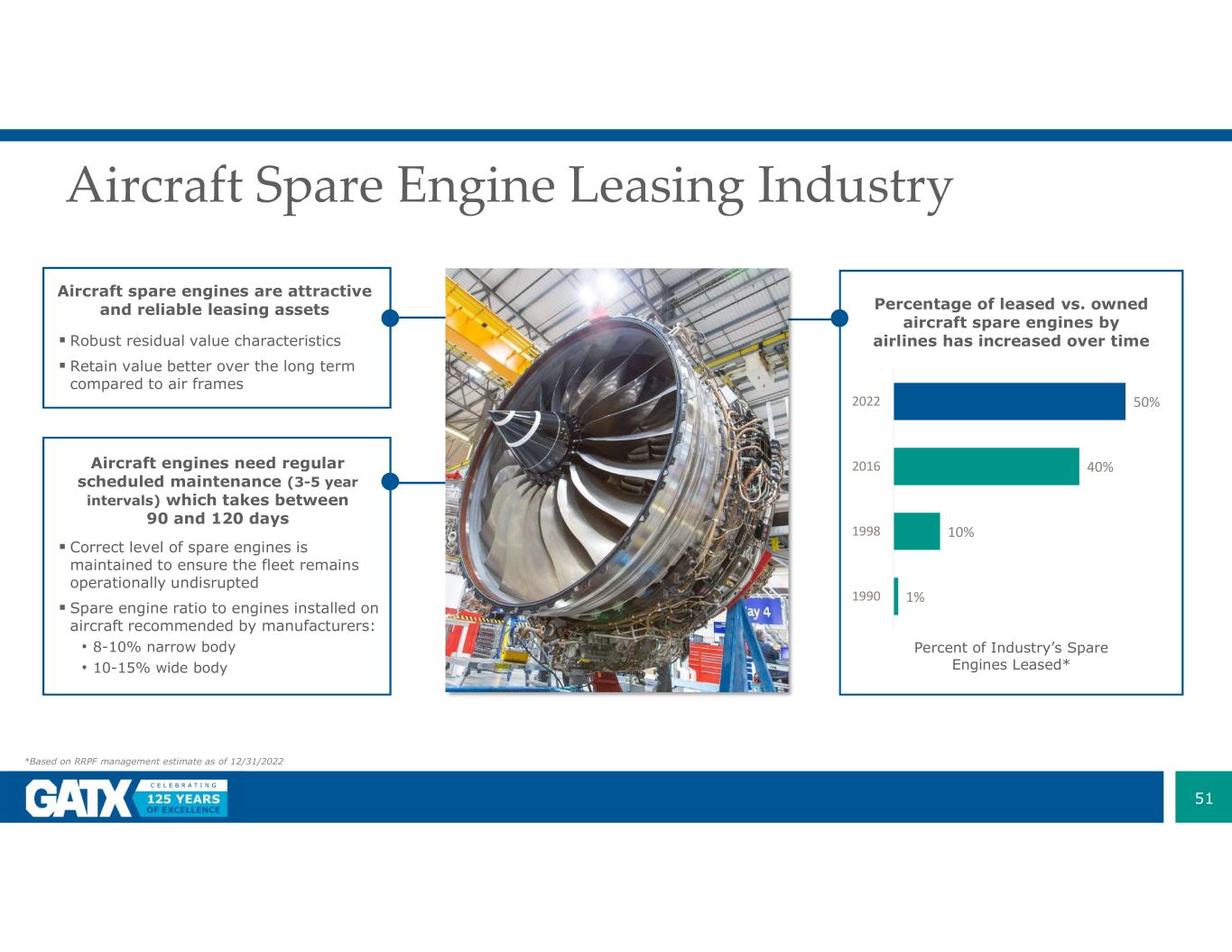 50 52%43% 2% $1,107M NBV Rolls-Royce & Partners Finance Affiliates (RRPF) RRPF* GEL Marine Equipment Other $0 $20 $40 $60 $80 $100 2002 2004 2006 2008 2010 2012 2014 2016 2018 2020 2022 RRPF Pre-Tax Income, Adjusted** ASSET M I X In January 2021, GATX commenced a direct investment program to opportunistically invest in aircraft spare engines As of 12/31/22, GEL, our wholly owned entity, has a total of 19 aircraft space engines with a net book value of $475M The engine lease administration for all GEL engines is managed by RRPF RRPF, our joint venture with Rolls-Royce plc, leases aircraft spare engines to a group of commercial aircraft operators worldwide and to Rolls-Royce for use in their engine maintenance program RRPF generates additional revenue from third- party asset management, a relatively small but important part of the business *The equity method is used to account for investments in joint ventures **Non-GAAP excludes tax adjustments and other items As of 12/31/2022 GATX Engine Leasing (GEL) Portfolio Management Overview 3%