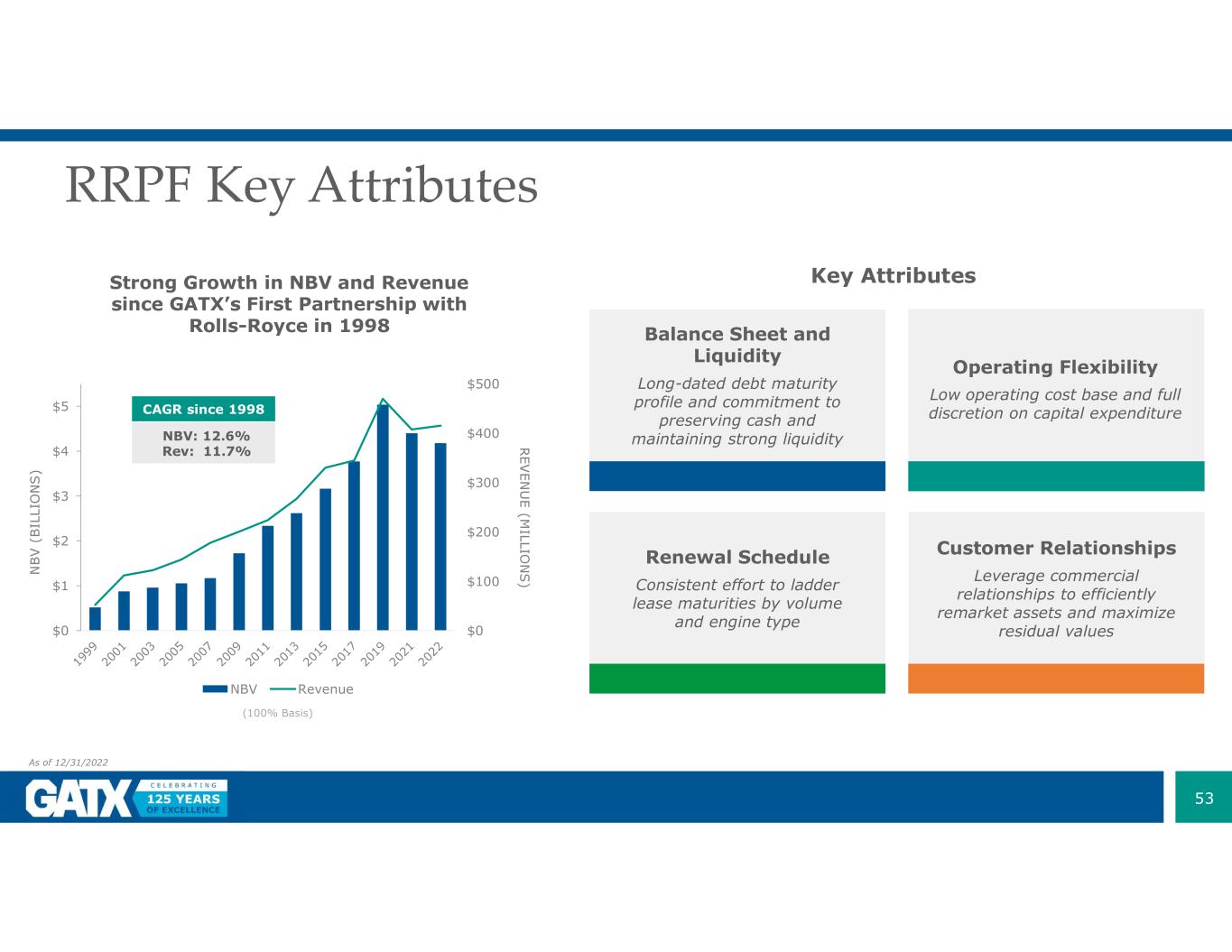 53 $0 $100 $200 $300 $400 $500 $0 $1 $2 $3 $4 $5 NBV Revenue Strong Growth in NBV and Revenue First Partnership with Rolls-Royce in 1998 Balance Sheet and Liquidity Long-dated debt maturity profile and commitment to preserving cash and maintaining strong liquidity Renewal Schedule Consistent effort to ladder lease maturities by volume and engine type Customer Relationships Leverage commercial relationships to efficiently remarket assets and maximize residual values Operating Flexibility Low operating cost base and full discretion on capital expenditure (100% Basis) NBV: 12.6% Rev: 11.7% CAGR since 1998 Key Attributes As of 12/31/2022 RRPF Key Attributes