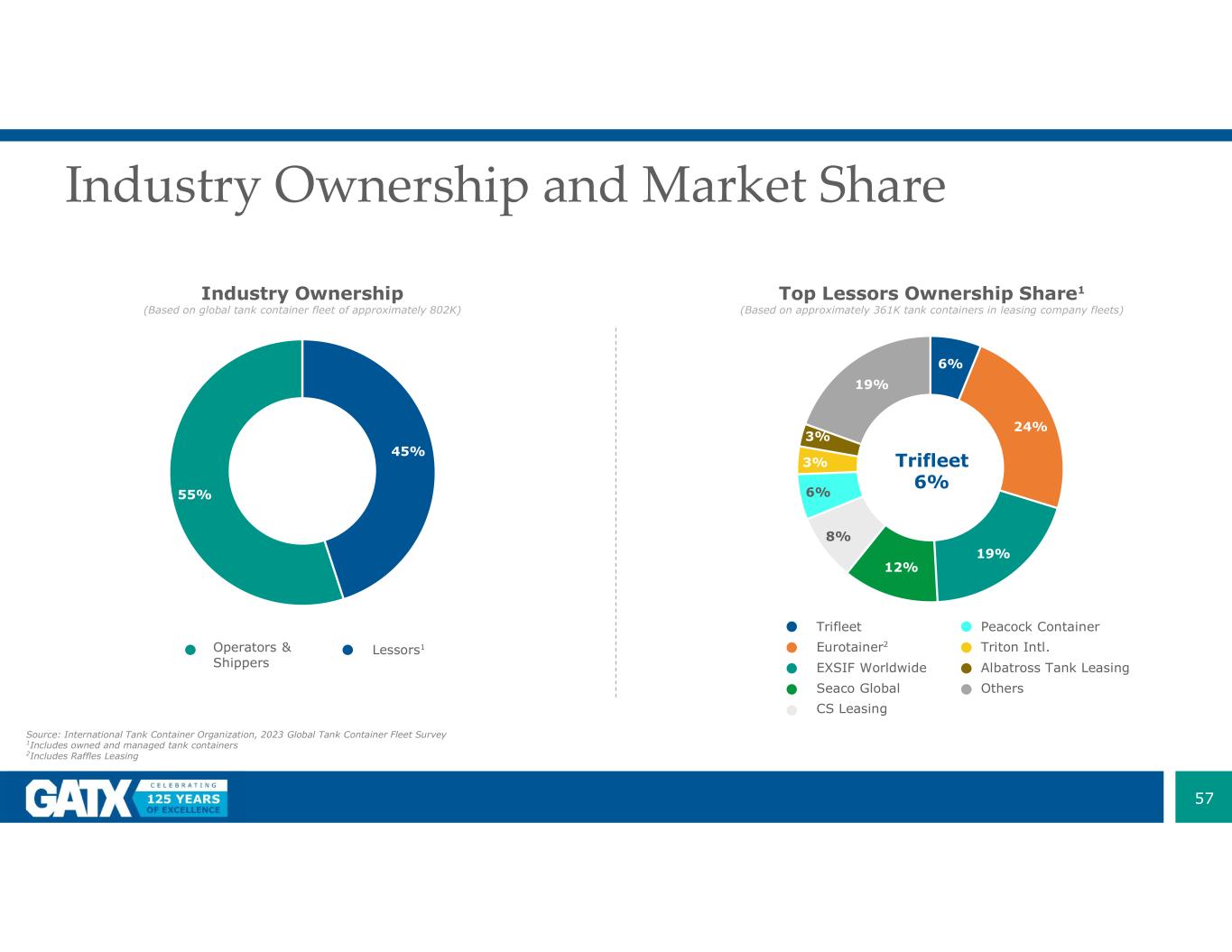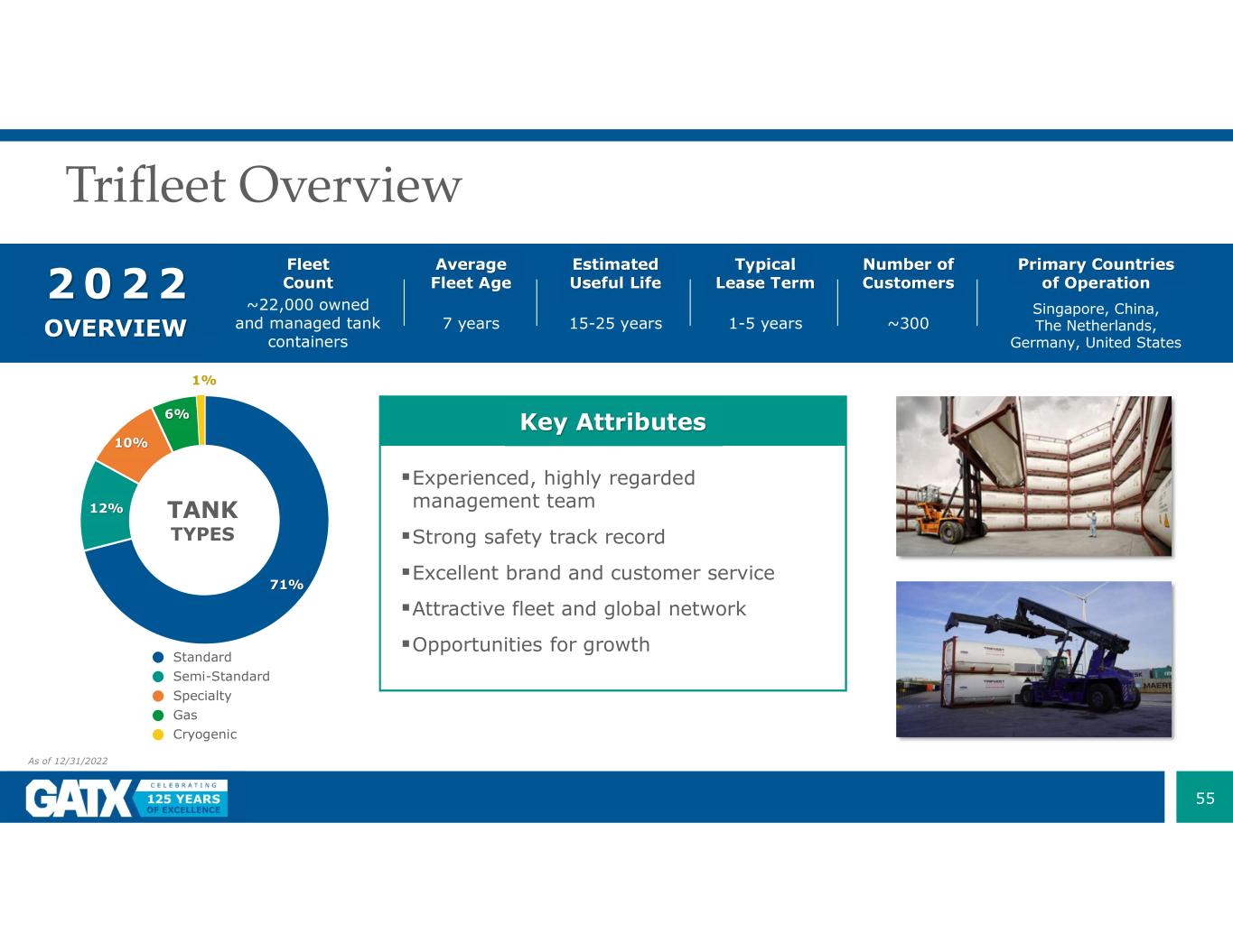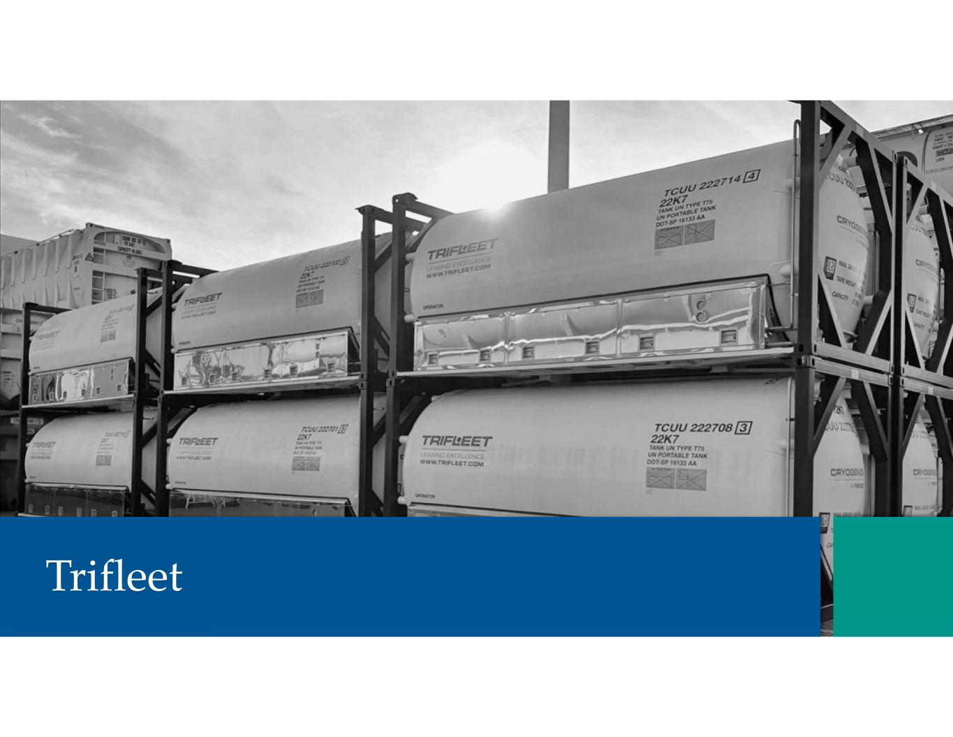 55 71% 12% 10% 6% Fleet Count Average Fleet Age Estimated Useful Life Typical Lease Term Primary Countries of Operation ~22,000 owned and managed tank containers 7 years 15-25 years 1-5 years TANK TYPES Number of Customers ~300 Standard Semi-Standard Specialty Gas Cryogenic 1% Experienced, highly regarded management team Strong safety track record Excellent brand and customer service Attractive fleet and global network Opportunities for growth Key Attributes 2 0 2 2 OVERVIEW Singapore, China, The Netherlands, Germany, United States As of 12/31/2022 Trifleet Overview