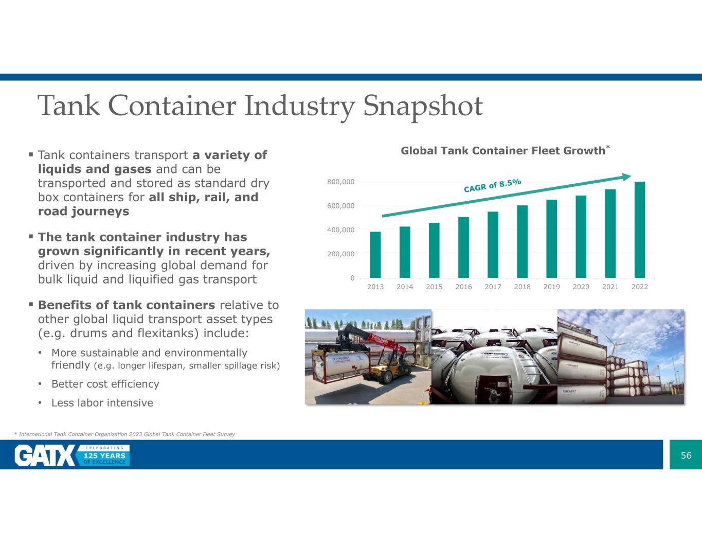 56 Tank Container Industry Snapshot 0 200,000 400,000 600,000 800,000 2013 2014 2015 2016 2017 2018 2019 2020 2021 2022 Tank containers transport a variety of liquids and gases and can be transported and stored as standard dry box containers for all ship, rail, and road journeys The tank container industry has grown significantly in recent years, driven by increasing global demand for bulk liquid and liquified gas transport Benefits of tank containers relative to other global liquid transport asset types (e.g. drums and flexitanks) include: More sustainable and environmentally friendly (e.g. longer lifespan, smaller spillage risk) Better cost efficiency Less labor intensive Global Tank Container Fleet Growth* * International Tank Container Organization 2023 Global Tank Container Fleet Survey