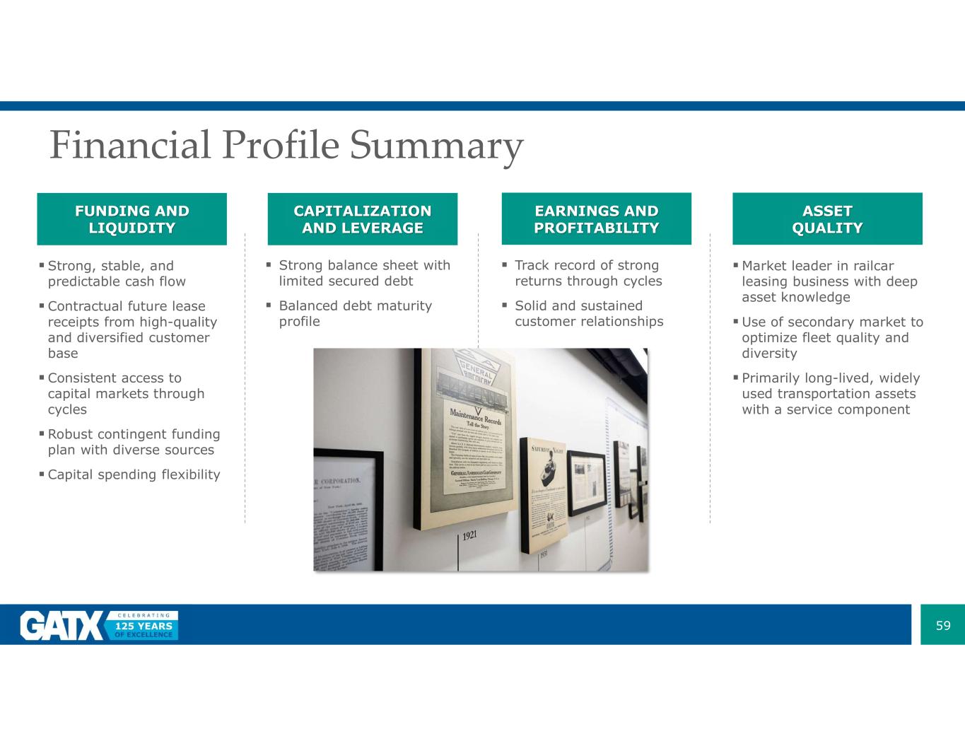 59 Strong, stable, and predictable cash flow Contractual future lease receipts from high-quality and diversified customer base Consistent access to capital markets through cycles Robust contingent funding plan with diverse sources Capital spending flexibility Market leader in railcar leasing business with deep asset knowledge Use of secondary market to optimize fleet quality and diversity Primarily long-lived, widely used transportation assets with a service component Track record of strong returns through cycles Solid and sustained customer relationships Strong balance sheet with limited secured debt Balanced debt maturity profile FUNDING AND LIQUIDITY CAPITALIZATION AND LEVERAGE EARNINGS AND PROFITABILITY ASSET QUALITY Financial Profile Summary