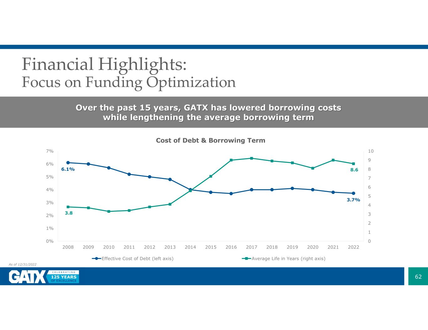 62 6.1% 3.7% 3.8 8.6 0 1 2 3 4 5 6 7 8 9 10 0% 1% 2% 3% 4% 5% 6% 7% 2008 2009 2010 2011 2012 2013 2014 2015 2016 2017 2018 2019 2020 2021 2022 Effective Cost of Debt (left axis) Average Life in Years (right axis) Cost of Debt & Borrowing Term Over the past 15 years, GATX has lowered borrowing costs while lengthening the average borrowing term As of 12/31/2022 Financial Highlights: Focus on Funding Optimization