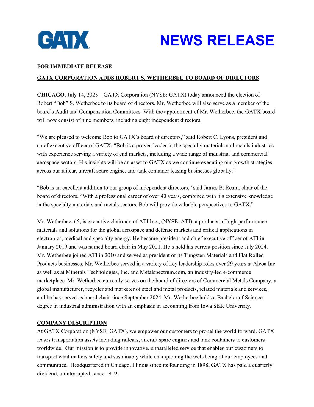 FOR IMMEDIATE RELEASE GATX CORPORATION ADDS ROBERT S. WETHERBEE TO BOARD OF DIRECTORS CHICAGO, July 14, 2025 ‒ GATX Corporation (NYSE: GATX) today announced the election of Robert “Bob” S. Wetherbee to its board of directors. Mr. Wetherbee will also serve as a member of the board’s Audit and Compensation Committees. With the appointment of Mr. Wetherbee, the GATX board will now consist of nine members, including eight independent directors. “We are pleased to welcome Bob to GATX’s board of directors,” said Robert C. Lyons, president and chief executive officer of GATX. “Bob is a proven leader in the specialty materials and metals industries with experience serving a variety of end markets, including a wide range of industrial and commercial aerospace sectors. His insights will be an asset to GATX as we continue executing our growth strategies across our railcar, aircraft spare engine, and tank container leasing businesses globally.” “Bob is an excellent addition to our group of independent directors,” said James B. Ream, chair of the board of directors. “With a professional career of over 40 years, combined with his extensive knowledge in the specialty materials and metals sectors, Bob will provide valuable perspectives to GATX.” Mr. Wetherbee, 65, is executive chairman of ATI Inc., (NYSE: ATI), a producer of high-performance materials and solutions for the global aerospace and defense markets and critical applications in electronics, medical and specialty energy. He became president and chief executive officer of ATI in January 2019 and was named board chair in May 2021. He’s held his current position since July 2024. Mr. Wetherbee joined ATI in 2010 and served as president of its Tungsten Materials and Flat Rolled Products businesses. Mr. Wetherbee served in a variety of key leadership roles over 29 years at Alcoa Inc. as well as at Minerals Technologies, Inc. and Metalspectrum.com, an industry-led e-commerce marketplace. Mr. Wetherbee currently serves on the board of directors of Commercial Metals Company, a global manufacturer, recycler and marketer of steel and metal products, related materials and services, and he has served as board chair since September 2024. Mr. Wetherbee holds a Bachelor of Science degree in industrial administration with an emphasis in accounting from Iowa State University. COMPANY DESCRIPTION At GATX Corporation (NYSE: GATX), we empower our customers to propel the world forward. GATX leases transportation assets including railcars, aircraft spare engines and tank containers to customers worldwide. Our mission is to provide innovative, unparalleled service that enables our customers to transport what matters safely and sustainably while championing the well-being of our employees and communities. Headquartered in Chicago, Illinois since its founding in 1898, GATX has paid a quarterly dividend, uninterrupted, since 1919. NEWS RELEASE