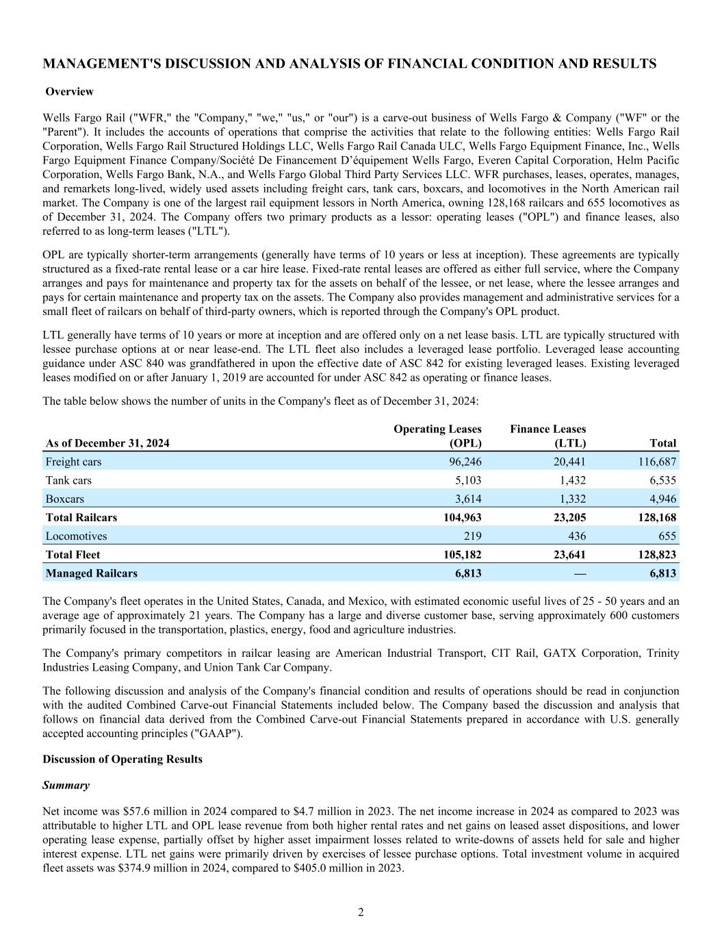 MANAGEMENT'S DISCUSSION AND ANALYSIS OF FINANCIAL CONDITION AND RESULTS Overview Wells Fargo Rail ("WFR," the "Company," "we," "us," or "our") is a carve-out business of Wells Fargo & Company ("WF" or the "Parent"). It includes the accounts of operations that comprise the activities that relate to the following entities: Wells Fargo Rail Corporation, Wells Fargo Rail Structured Holdings LLC, Wells Fargo Rail Canada ULC, Wells Fargo Equipment Finance, Inc., Wells Fargo Equipment Finance Company/Société De Financement D’équipement Wells Fargo, Everen Capital Corporation, Helm Pacific Corporation, Wells Fargo Bank, N.A., and Wells Fargo Global Third Party Services LLC. WFR purchases, leases, operates, manages, and remarkets long-lived, widely used assets including freight cars, tank cars, boxcars, and locomotives in the North American rail market. The Company is one of the largest rail equipment lessors in North America, owning 128,168 railcars and 655 locomotives as of December 31, 2024. The Company offers two primary products as a lessor: operating leases ("OPL") and finance leases, also referred to as long-term leases ("LTL"). OPL are typically shorter-term arrangements (generally have terms of 10 years or less at inception). These agreements are typically structured as a fixed-rate rental lease or a car hire lease. Fixed-rate rental leases are offered as either full service, where the Company arranges and pays for maintenance and property tax for the assets on behalf of the lessee, or net lease, where the lessee arranges and pays for certain maintenance and property tax on the assets. The Company also provides management and administrative services for a small fleet of railcars on behalf of third-party owners, which is reported through the Company's OPL product. LTL generally have terms of 10 years or more at inception and are offered only on a net lease basis. LTL are typically structured with lessee purchase options at or near lease-end. The LTL fleet also includes a leveraged lease portfolio. Leveraged lease accounting guidance under ASC 840 was grandfathered in upon the effective date of ASC 842 for existing leveraged leases. Existing leveraged leases modified on or after January 1, 2019 are accounted for under ASC 842 as operating or finance leases. The table below shows the number of units in the Company's fleet as of December 31, 2024: As of December 31, 2024 Operating Leases (OPL) Finance Leases (LTL) Total Freight cars 96,246 20,441 116,687 Tank cars 5,103 1,432 6,535 Boxcars 3,614 1,332 4,946 Total Railcars 104,963 23,205 128,168 Locomotives 219 436 655 Total Fleet 105,182 23,641 128,823 Managed Railcars 6,813 — 6,813 The Company's fleet operates in the United States, Canada, and Mexico, with estimated economic useful lives of 25 - 50 years and an average age of approximately 21 years. The Company has a large and diverse customer base, serving approximately 600 customers primarily focused in the transportation, plastics, energy, food and agriculture industries. The Company's primary competitors in railcar leasing are American Industrial Transport, CIT Rail, GATX Corporation, Trinity Industries Leasing Company, and Union Tank Car Company. The following discussion and analysis of the Company's financial condition and results of operations should be read in conjunction with the audited Combined Carve-out Financial Statements included below. The Company based the discussion and analysis that follows on financial data derived from the Combined Carve-out Financial Statements prepared in accordance with U.S. generally accepted accounting principles ("GAAP"). Discussion of Operating Results Summary Net income was $57.6 million in 2024 compared to $4.7 million in 2023. The net income increase in 2024 as compared to 2023 was attributable to higher LTL and OPL lease revenue from both higher rental rates and net gains on leased asset dispositions, and lower operating lease expense, partially offset by higher asset impairment losses related to write-downs of assets held for sale and higher interest expense. LTL net gains were primarily driven by exercises of lessee purchase options. Total investment volume in acquired fleet assets was $374.9 million in 2024, compared to $405.0 million in 2023. 2